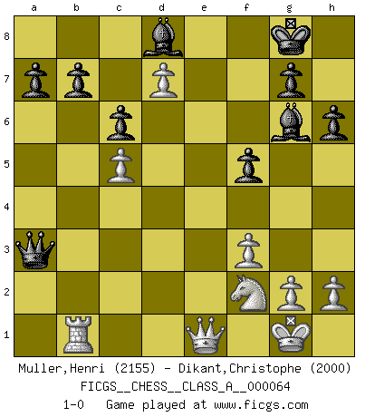 Last move : 1-0 2010 February 7 11:12:0 [Event "FICGS__CHESS__CLASS_A__000064"] [Site "FICGS"] [Date "2009.12.31"] [Round "1"] [White "Muller,Henri"] [Black "Dikant,Christophe"] [Result "1-0"] [WhiteElo "2155"] [BlackElo "2000"] 1.e4 d5 2.exd5 Nf6 3.d4 Bg4 4.f3 Bf5 5.Bb5+ Nbd7 6.c4 e6 7.dxe6 Bxe6 8.d5 Bf5 9.Nc3 Bb4 10.Nge2 O-O 11.Bxd7 Nxd7 12.O-O Re8 13.Ng3 Bg6 14.Nce4 Nc5 15.a3 Nxe4 16.Nxe4 Bf8 17.Re1 h6 18.Bf4 c6 19.d6 f5 20.Nf2 Qb6 21.Rxe8 Rxe8 22.c5 Qxb2 23.Rb1 Qxa3 24.d7 Rd8 25.Bc7 Be7 26.Bxd8 Bxd8 27.Qe1 1-0 Scandinavian defense Kingside Castling by player Black (move 10) Kingside Castling by player White (move 12) Player White won this chess game. Follow this game move after move (download)Help your pieces so they can help you. (Paul Morphy) Im Blitz ist es einfacher mit einer Figur weniger anzugreifen, als sich mit einer Mehrfigur zu verteidigen. (Mikhail Nekhemyevich Tal) El Ajedrez es un juego de pelea el cual es puramente intelectual e incluye la suerte. (Richard Reti) Il n'y a pas eu de défaite parce que je ne crois pas que cet ordinateur ait jamais existé. IBM a triché en refusant d'imprimer les modes de recherche de la machine. C'est évident, pendant le match, des coups décisifs ont été joués par des êtres humains. Aujourd'hui, les meilleurs spécialistes en informatique ne peuvent toujours pas expliquer comment Deep-Blue a pu jouer contre la logique des ordinateurs. IBM a gagné une guerre de communication, mais ils sont incapables de prouver que l'ordinateur a gagné tout seul. (Garry Kasparov) Those who make the worst use of their time are the first to complain of its brevity. (Jean de la Bruyere)