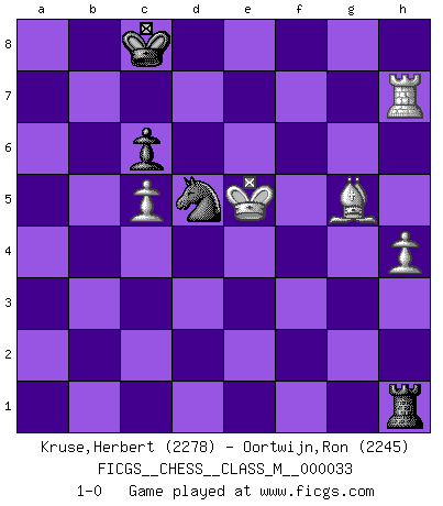 Last move : 1-0 2010 May 12 8:10:39 [Event "FICGS__CHESS__CLASS_M__000033"] [Site "FICGS"] [Date "2009.12.31"] [Round "1"] [White "Kruse,Herbert"] [Black "Oortwijn,Ron"] [Result "1-0"] [WhiteElo "2278"] [BlackElo "2245"] 1.e4 c5 2.Nf3 Nc6 3.d4 cxd4 4.Nxd4 Nf6 5.Nc3 e6 6.Nxc6 bxc6 7.e5 Nd5 8.Ne4 f5 9.exf6 Nxf6 10.Nd6+ Bxd6 11.Qxd6 Ba6 12.Bxa6 Qa5+ 13.Bd2 Qxa6 14.f3 Qc4 15.Bc3 Qd5 16.Qg3 Nh5 17.Qh4 Qf5 18.O-O-O Qf4+ 19.Qxf4 Nxf4 20.Bxg7 Rg8 21.Be5 Nxg2 22.Rd4 a5 23.Rg1 O-O-O 24.Ra4 Ne3 25.Re1 Nd5 26.Rxa5 Kb7 27.Rd1 Ra8 28.Rxa8 Rxa8 29.c4 Nb6 30.c5 Nd5 31.Rg1 h5 32.Rg7 Rxa2 33.Rxd7+ Ka6 34.Kd2 Ra1 35.Rd6 Kb5 36.Rxe6 Rg1 37.Rh6 Rg5 38.Bd6 Rg2+ 39.Kd3 Rxb2 40.Rxh5 Rb3+ 41.Kd4 Rxf3 42.Rh8 Rf1 43.Rb8+ Ka5 44.h4 Re1 45.Rb2 Rd1+ 46.Ke4 Rf1 47.Rh2 Nf6+ 48.Kd4 Rd1+ 49.Kc3 Ne4+ 50.Kc4 Ka6 51.Bf4 Ra1 52.Rb2 Ka7 53.Bb8+ Ka8 54.Bd6 Rd1 55.Bf4 Rd5 56.Re2 Nf6 57.Re5 Rd1 58.Rf5 Nd5 59.Bg5 Rh1 60.Rf7 Kb8 61.Kd4 Kc8 62.Ke5 Nb4 63.Re7 Nd5 64.Rh7 1-0 Sicilian defense Queenside Castling by player White (move 18) Queenside Castling by player Black (move 23) 10 pieces endgame at move 40 : White KRBPPP , Black KRNP WHITE : King + 1 Rook 1 Bishop 3 Pawns BLACK : King + 1 Rook 1 Knight 1 Pawn 9 pieces endgame at move 41 : White KRBPP , Black KRNP WHITE : King + 1 Rook 1 Bishop 2 Pawns BLACK : King + 1 Rook 1 Knight 1 Pawn Player White won this chess game. Follow this game move after move (download)There is no remorse like the remorse of Chess. (H. G. Wells) Du kannst im Schach nur gut werden, wenn du das Spiel liebst. (Robert James Fischer) El jugador blanco perdió porque fallo en recordar la coreccta continuación y tuvo que pensar por sí mismo las movidas. (Siegbert Tarrasch) Le pion, dans sa simplicité, marche droit devant lui, mais lorsqu'il prend, il le fait obliquement? Ainsi l'homme, tant qu'il reste pauvre, marche dans la droiture et vit honnêtement, mais lorsqu'il recherche les honneurs, il flatte, se parjure et, par les voies obliques, cherche une position supérieure sur l'échiquier du monde. (Jean de Galles) The problem with manipulation is that people can turn on you. (Horatio Caine, C.S.I. Miami)