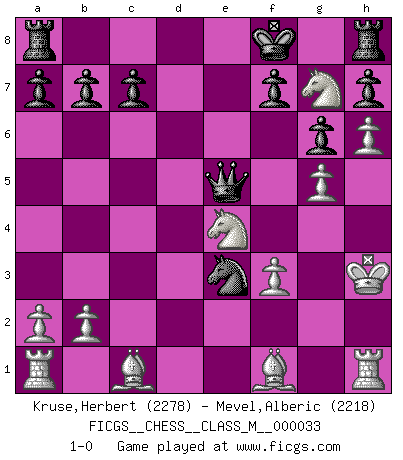 Last move : 1-0 2010 February 18 16:23:3 [Event "FICGS__CHESS__CLASS_M__000033"] [Site "FICGS"] [Date "2009.12.31"] [Round "1"] [White "Kruse,Herbert"] [Black "Mevel,Alberic"] [Result "1-0"] [WhiteElo "2278"] [BlackElo "2218"] 1.e4 d5 2.exd5 Nf6 3.d4 Bg4 4.f3 Bf5 5.g4 Bg6 6.c4 e6 7.Nc3 exd5 8.g5 Nfd7 9.Nxd5 Nc6 10.h4 Nb6 11.Qe2+ Be7 12.h5 Bf5 13.Nxe7 Nxd4 14.Nxf5 Nxe2 15.Nxe2 g6 16.Ng7+ Kf8 17.h6 Nxc4 18.Nc3 Qe7+ 19.Kf2 Qc5+ 20.Kg3 Ne3 21.Ne4 Qe5+ 22.Kh3 1-0 Costantino Proietti Sacrifing the Queen for 2B+N! Not easy to find out. Scandinavian defense Player White won this chess game. Follow this game move after move (download)In Chess, just as in life, today's bliss may be tomorrow's poison. (Assaic) Ich las kürzlich ein Buch von Nietzsche. Er sagte Religion verdumme nur die Menschen. Ich stimme zu. (Robert James Fischer) Nos gusta pensar. (Gary Kasparov) Toutes choses étant égales, c'est la conviction qui gagne. Alliée à une volonté de vaincre, elle sert de détonateur, suscite des idées, disperse les doutes et aide à penser clairement. (Robert Fischer) Nowadays, anyone who cannot speak English and is incapable of using the Internet is regarded as backward. (Al-Waleed bin Talal)