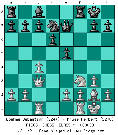 Last move : 1/2-1/2 2010 May 27 8:30:52 [Event "FICGS__CHESS__CLASS_M__000033"] [Site "FICGS"] [Date "2009.12.31"] [Round "1"] [White "Boehme,Sebastian"] [Black "Kruse,Herbert"] [Result "1/2-1/2"] [WhiteElo "2244"] [BlackElo "2278"] 1.d4 Nf6 2.c4 e6 3.g3 Bb4+ 4.Bd2 Qe7 5.Nf3 Nc6 6.Nc3 Bxc3 7.Bxc3 Ne4 8.Rc1 O-O 9.Bg2 d6 10.d5 Nb8 11.Qc2 Nxc3 12.Qxc3 Nd7 13.dxe6 fxe6 14.O-O e5 1/2-1/2 Catalan Opening Kingside Castling by player Black (move 8) Kingside Castling by player White (move 14) This chess game ended in a draw. Follow this game move after move (download)When in doubt... play Chess ! (Tevis) Zu meiner Zeit war ein 20 jähriger ein junger Spieler, heute ist er ein Veteran. (Garry Kasparov) Mi estilo es algo parecido entre un poco de Tal y Petrosian. (Reshevsky) La vérité est comme le meilleur coup aux échecs : elle existe, mais il faut la chercher. (Arturo Perez-Reverte) Better than a thousand days of diligent study is one day with a great teacher. (Japanese proverb)