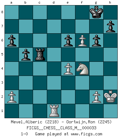 Last move : 1-0 2010 July 7 20:32:17 [Event "FICGS__CHESS__CLASS_M__000033"] [Site "FICGS"] [Date "2009.12.31"] [Round "1"] [White "Mevel,Alberic"] [Black "Oortwijn,Ron"] [Result "1-0"] [WhiteElo "2218"] [BlackElo "2245"] 1.e4 c5 2.Nf3 Nc6 3.Bb5 a6 4.Bxc6 dxc6 5.d3 g6 6.h3 Bg7 7.O-O Nf6 8.Be3 c4 9.Nc3 cxd3 10.cxd3 O-O 11.Rc1 b5 12.Qd2 Re8 13.Bd4 Bb7 14.Qe3 Rc8 15.Rfd1 Qc7 16.Be5 Ng4 17.hxg4 Bxe5 18.Nxe5 Qxe5 19.d4 Qc7 20.g5 c5 21.d5 Red8 22.b3 e6 23.f3 Qe5 24.dxe6 fxe6 25.Rxd8+ Rxd8 26.Ne2 Rc8 27.Qf4 Qg7 28.Rd1 Qe7 29.Qe5 c4 30.bxc4 Rxc4 31.Nf4 Rc8 32.Kh2 Rc5 33.Qf6 Qxf6 34.gxf6 Bxe4 35.fxe4 1-0 Sicilian : Nimzovich-Rossolimo attack (without ...d6) Kingside Castling by player White (move 7) Kingside Castling by player Black (move 10) Player White won this chess game. Follow this game move after move (download)Chess holds its master in its own bonds, shackling the mind and brain so that the inner freedom of the very strongest must suffer. (Albert Einstein) Die Idee von Capablanca, Schach als Fach in den Schulen zu lehren, ist großartig. (Fidel Castro) Yo creo que el Ajedrez posee una magia que es también una ayuda en la edad avanzada. Una rodilla reumática es olvidada durante una partida de Ajedrez y otros eventos pueden parecer algo sin importancia comparada a una catástrofe en el tablero de Ajedrez. (Vlastimil Hort) On a dit que l'homme se distingue de l'animal par le fait qu'il achète plus de livres qu'il ne peut en lire. Je voudrais suggérer qu'inclure à la liste des livres quelques livres d'échecs rendrait la distinction manifeste. (Edward Lasker) I fear not the man who has practiced 10,000 kicks once, but I fear the man who has practiced one kick 10,000 times. (Bruce Lee)