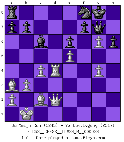 Last move : 1-0 2010 July 11 9:20:39 [Event "FICGS__CHESS__CLASS_M__000033"] [Site "FICGS"] [Date "2009.12.31"] [Round "1"] [White "Oortwijn,Ron"] [Black "Yarkov,Evgeny"] [Result "1-0"] [WhiteElo "2245"] [BlackElo "2217"] 1.e4 c5 2.Nf3 Nc6 3.d4 cxd4 4.Nxd4 Nf6 5.Nc3 d6 6.Bg5 e6 7.Qd2 Be7 8.O-O-O O-O 9.f4 Nxd4 10.Qxd4 Qa5 11.Bc4 Bd7 12.e5 dxe5 13.fxe5 Bc6 14.Bd2 Nd7 15.Nd5 Qd8 16.Nxe7+ Qxe7 17.Rhe1 Rfd8 18.Qg4 Nf8 19.Bd3 Rd7 20.Bb4 Qd8 21.g3 Ng6 22.Bd6 Qb6 23.Qe2 Ne7 24.c4 g6 25.g4 Nc8 26.Ba3 Qd8 27.Bc2 Qg5+ 28.Kb1 Rxd1+ 29.Rxd1 Nb6 30.Rd4 Qh4 31.b3 Qh6 32.Qf2 Qg7 33.h4 h6 34.h5 Nd7 35.Qd2 Nf8 36.hxg6 1-0 This chess game has been lost on time (started : 2009.12.31 19:52:4) Sicilian defense Queenside Castling by player White (move 8) Kingside Castling by player Black (move 8) Player White won this chess game. Follow this game move after move (download)Bobby just drops the pieces and they fall on the right squares. (Miguel Najdorf) Ivan Sokolov treibt mich als Beifahrer an mit go Loeky go - . (Loek van Wely) El muchacho (en ese entonces un niño de 12 años llamado Anatoly Karpov) no tiene ni idea de lo que es el Ajedrez y no hay futuro en absoluto para el en esta profesión. (Mikhail Botvinnik) Plusieurs personnes se sont demandées comment Tal faisait pour gagner... En fait, c'est très simple ! Il met ses pièces au centre de l'échiquier et les sacrifie quelque part ! (David Bronstein) All politicians must be presumed guilty until they are proven innocent. (Dinesh De Silva)