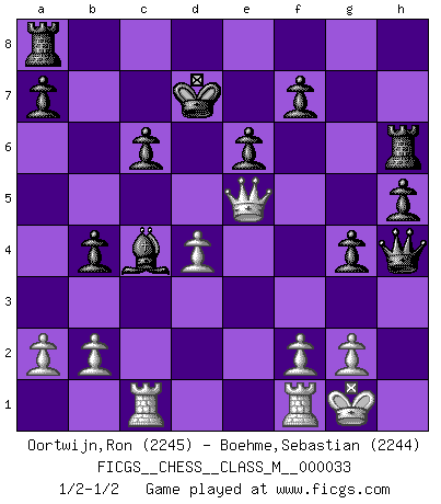 Last move : 1/2-1/2 2010 May 6 11:58:14 [Event "FICGS__CHESS__CLASS_M__000033"] [Site "FICGS"] [Date "2009.12.31"] [Round "1"] [White "Oortwijn,Ron"] [Black "Boehme,Sebastian"] [Result "1/2-1/2"] [WhiteElo "2245"] [BlackElo "2244"] 1.d4 d5 2.c4 e6 3.Nc3 c6 4.Nf3 Nf6 5.Bg5 h6 6.Bh4 dxc4 7.e4 g5 8.Bg3 b5 9.Ne5 h5 10.h4 g4 11.Be2 b4 12.Na4 Nxe4 13.O-O Ba6 14.Bf4 Bh6 15.Qc2 Bxf4 16.Qxe4 Bxe5 17.Qxe5 Rh6 18.Nc5 Nd7 19.Nxd7 Kxd7 20.Rac1 Qxh4 21.Bxc4 Bxc4 1/2-1/2 QGD : Semi-Slav Kingside Castling by player White (move 13) This chess game ended in a draw. Follow this game move after move (download)Avoid the crowd. Do your own thinking independently. Be the Chess player, not the Chess piece. (Ralph Charell) Über Karpov: Er war und ist ein Vertreter der russischen Reaktionäre. Das steckt tief in seiner Seele, wehalb ich nicht nett mit ihm umgehen kann. (Viktor Kortschnoi) Ayuda a tus piezas para que ellas te puedan ayudar. (Paul Morphy) Il n'y a pas eu de défaite parce que je ne crois pas que cet ordinateur ait jamais existé. IBM a triché en refusant d'imprimer les modes de recherche de la machine. C'est évident, pendant le match, des coups décisifs ont été joués par des êtres humains. Aujourd'hui, les meilleurs spécialistes en informatique ne peuvent toujours pas expliquer comment Deep-Blue a pu jouer contre la logique des ordinateurs. IBM a gagné une guerre de communication, mais ils sont incapables de prouver que l'ordinateur a gagné tout seul. (Garry Kasparov) At last I discovered the true beauty of chess. So I proposed to her. (Dinesh De Silva)