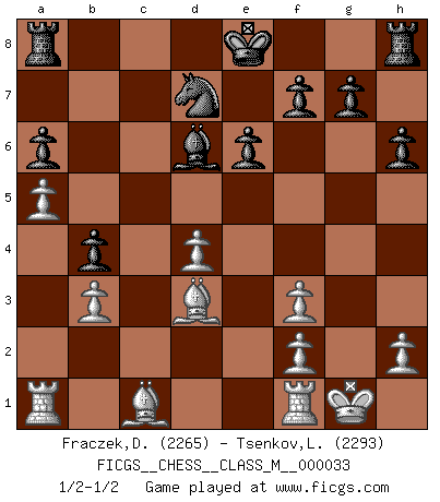 Last move : 1/2-1/2 2010 March 11 13:50:31 [Event "FICGS__CHESS__CLASS_M__000033"] [Site "FICGS"] [Date "2009.12.31"] [Round "1"] [White "Fraczek,Dariusz"] [Black "Tsenkov,Ljubomir"] [Result "1/2-1/2"] [WhiteElo "2265"] [BlackElo "2293"] 1.Nf3 Nf6 2.c4 c6 3.Nc3 d5 4.d4 e6 5.e3 Nbd7 6.Bd3 dxc4 7.Bxc4 b5 8.Bd3 a6 9.a4 Bb7 10.O-O b4 11.Ne4 c5 12.Nxf6+ Qxf6 13.a5 h6 14.b3 Bxf3 15.Qxf3 Qxf3 16.gxf3 cxd4 17.Be4 Rb8 18.exd4 Bd6 19.Bd3 Ra8 20.Be4 Rb8 21.Bd3 Ra8 1/2-1/2 Reti Opening Kingside Castling by player White (move 10) This chess game ended in a draw. Follow this game move after move (download)Chess is a foolish expedient for making idle people believe they are doing something very clever when they are only wasting their time. (George Bernard Shaw) Der Vorposten provoziert a) eine Basis für neue Angriffe und b) eine Schwächung der gegnerischen Widerstandskraft in der fraglichen Linie. (Aaron Nimzowitsch) Yo jugué Ajedrez con el y a veces le pude haber ganado solo que siempre devuelve su última jugada y juega la partida de manera diferente. (Mark Twain) Les réformistes prétendent que les progrès de la théorie conduiront à la disparition des échecs, et qu'il faut, pour leur rendre vie, en remanier les règles. En réalité, qu'exprime cette affirmation? Le mépris de l'intuition, de l'imagination et de tous les autres éléments qui font des échecs un art. (Alexander Alekhine) Logic : The art of thinking and reasoning in strict accordance with the limitations and incapacities of the human misunderstanding. (Ambrose Bierce)