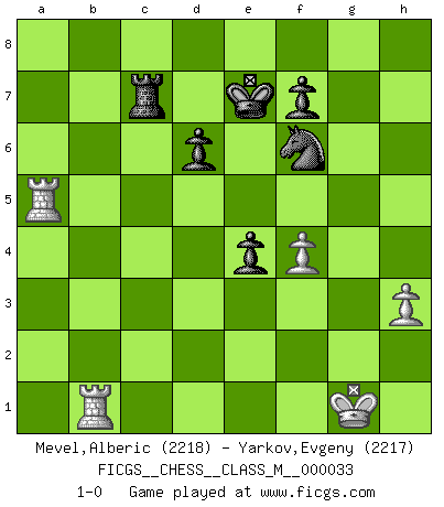 Last move : 1-0 2011 March 17 12:20:39 [Event "FICGS__CHESS__CLASS_M__000033"] [Site "FICGS"] [Date "2009.12.31"] [Round "1"] [White "Mevel,Alberic"] [Black "Yarkov,Evgeny"] [Result "1-0"] [WhiteElo "2218"] [BlackElo "2217"] 1.e4 c5 2.Nf3 Nc6 3.Bb5 d6 4.O-O Bd7 5.Re1 Nf6 6.c3 a6 7.Ba4 b5 8.Bc2 e5 9.h3 Be7 10.d4 O-O 11.d5 Na5 12.Nbd2 Qb6 13.Nf1 Qc7 14.b3 Rfd8 15.Bg5 Nb7 16.Ng3 c4 17.Qd2 h6 18.Bxh6 gxh6 19.Qxh6 Nh7 20.Re3 Rdc8 21.Qh5 cxb3 22.axb3 Qd8 23.Nf5 Bxf5 24.exf5 Nf6 25.Qg5+ Kf8 26.Rae1 Ng8 27.Qh5 Rc7 28.g4 Nf6 29.Qh8+ Ng8 30.Qh5 Rac8 31.c4 bxc4 32.b4 a5 33.bxa5 Nc5 34.g5 Ra8 35.Rc3 Nd3 36.Bxd3 cxd3 37.Rxd3 Rxa5 38.f6 Bxf6 39.gxf6 Qxf6 40.Ng5 Qh6 41.Qg4 Nf6 42.Qf5 Rxd5 43.Nh7+ Qxh7 44.Qxh7 Nxh7 45.Rxd5 Ke7 46.f4 Nf6 47.Ra5 e4 48.Rb1 1-0 This chess game has been lost on time (started : 2009.12.31 19:52:4) Sicilian : Nimzovich-Rossolimo attack (without ...d6) Kingside Castling by player White (move 4) Kingside Castling by player Black (move 10) Player White won this chess game. Follow this game move after move (download)One doesn't have to play well, it's enough to play better than your opponent. (Siegbert Tarrasch) Ich verlor meine Bürgerrechte, mein Gehalt wurde mir nicht mehr bezahlt und ich wurde zensiert und durfte nicht mehr ins Ausland reisen. [nach dem Match Fischer-Taimanov 6:0] (Mark Taimanov) Evita las multitudes. Haz independientemente tu propio razonamiento. Trata de ser el jugador de Ajedrez, no la pieza de Ajedrez. (Ralph Charell) Votre seul travail dans les ouvertures est d'obtenir un milieu de partie jouable. (Lajos Portish) Somewhere in the world there is an epigram for every dilemma. (Hendrik Willem van Loon)