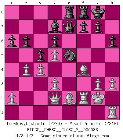 Last move : 1/2-1/2 2010 March 28 13:13:54 [Event "FICGS__CHESS__CLASS_M__000033"] [Site "FICGS"] [Date "2009.12.31"] [Round "1"] [White "Tsenkov,Ljubomir"] [Black "Mevel,Alberic"] [Result "1/2-1/2"] [WhiteElo "2293"] [BlackElo "2218"] 1.c4 e5 2.Nc3 Nc6 3.Nf3 Nf6 4.g3 Bc5 5.Nxe5 Bxf2+ 6.Kxf2 Nxe5 7.e4 c5 8.d3 d6 9.Kg2 O-O 10.Be2 Qd7 11.h3 Qe6 12.Be3 Bd7 13.Qd2 a6 14.Raf1 h6 15.Rf2 Rae8 16.b4 b6 17.Nd5 Nxd5 18.exd5 Qe7 19.Bf4 1/2-1/2 English : Four knights, kingside Fianchetto Kingside Castling by player Black (move 9) This chess game ended in a draw. Follow this game move after move (download)It is the aim of the modern school, not to treat every position according to one general law, but according to the principle inherent in the position. (Richard Reti) Wer sich die Fähigkeit anerziehen will im Schach selbstständig zu denken, der muß alles meiden, was leblos ist: ausgeklügelte Theorien, die sich auf sehr wenige Beispiele und eine Menge Hirngespinste stützen. (Emanuel Lasker) No existe un remordimiento como el remordimiento del Ajedrez. (H. G. Wells) Des idées, des idées, j'en ai cent, j'en ai mille. Des bonnes, des mauvaises, applicables, irréalisables... Il suffit de faire le tri ! (Roos) Life is pain my dear and anyone who says otherwise is selling something. (Princess Bride)