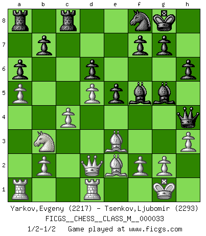 Last move : 1/2-1/2 2010 April 5 16:16:38 [Event "FICGS__CHESS__CLASS_M__000033"] [Site "FICGS"] [Date "2009.12.31"] [Round "1"] [White "Yarkov,Evgeny"] [Black "Tsenkov,Ljubomir"] [Result "1/2-1/2"] [WhiteElo "2217"] [BlackElo "2293"] 1.e4 c5 2.Nf3 d6 3.d4 cxd4 4.Nxd4 Nf6 5.Nc3 a6 6.Be2 e5 7.Nb3 Be7 8.Be3 O-O 9.O-O Be6 10.Qd2 Nbd7 11.a4 Qc7 12.a5 Rfc8 13.h3 Qc6 14.Bf3 Nf8 15.Rfd1 h6 16.Rac1 Qe8 17.Nd5 Nxd5 18.exd5 Bf5 19.Be2 Qa4 20.Ra1 Qh4 21.c4 Bg5 1/2-1/2 Sicilian : Najdorf, Opovcensky variation Kingside Castling by player Black (move 8) Kingside Castling by player White (move 9) This chess game ended in a draw. Follow this game move after move (download)A bad plan is better than none at all. (Frank Marshall) Gegen einen Schachcomputer zu verlieren ist wie Löcher in den Strümpfen zuhaben. Es ist nicht peinlich, solange man der einzige ist der es weiß. (Anonymous) La única cosa que los jugadores de Ajedrez tienen en común, es el Ajedrez. (Lodewijk Prins) C'est la seule position que je connaisse où les deux camps sont mals. Propos prêtés à V. Anand. Statistics can be made to prove anything - even the truth. (Author unknown)
