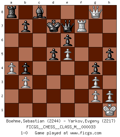 Last move : 1-0 2010 September 23 2:28:49 [Event "FICGS__CHESS__CLASS_M__000033"] [Site "FICGS"] [Date "2009.12.31"] [Round "1"] [White "Boehme,Sebastian"] [Black "Yarkov,Evgeny"] [Result "1-0"] [WhiteElo "2244"] [BlackElo "2217"] 1.d4 d5 2.c4 c6 3.Nf3 Nf6 4.Nc3 a6 5.a4 e6 6.Bg5 Be7 7.e3 a5 8.Be2 Na6 9.O-O O-O 10.Qb3 h6 11.Bh4 Nb4 12.Na2 g5 13.Nxb4 axb4 14.Bg3 Ne4 15.Bd3 h5 16.Qc2 Nxg3 17.fxg3 Bf6 18.Ne5 g4 19.Bg6 Bxe5 20.dxe5 Qg5 21.Bxf7+ Kg7 22.Rf6 Rxf7 23.Rxf7+ Kxf7 24.Qh7+ Ke8 25.Rf1 Qxe3+ 26.Kh1 Qg5 27.b3 Qe7 28.Qg8+ Kd7 29.cxd5 cxd5 30.Rf7 1-0 QGD Slav : 4.Nc3 Kingside Castling by player White (move 9) Kingside Castling by player Black (move 9) Player White won this chess game. Follow this game move after move (download)Place the contents of the Chess box in a hat, shake them up vigorously, pour them on the board from a height of two feet, and you get the style of Steinitz. (H. E. Bird) Sitze auf Deine Hände. (Siegbert Tarrasch) El Ajedrez es parte de una cultura y si una cultura esta en decadencia, entonces también el Ajedrez declinará. (Mikhail Botvinnik) Les échecs, c'est l'art d'analyser. (Mikhail Botvinnik) Chess is everything: art, science and sport. (Anatoly Karpov)