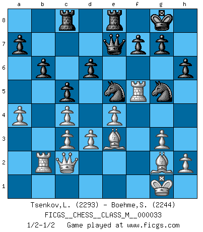 Last move : 1/2-1/2 2010 April 2 19:57:33 [Event "FICGS__CHESS__CLASS_M__000033"] [Site "FICGS"] [Date "2009.12.31"] [Round "1"] [White "Tsenkov,Ljubomir"] [Black "Boehme,Sebastian"] [Result "1/2-1/2"] [WhiteElo "2293"] [BlackElo "2244"] 1.c4 e5 2.Nc3 Nf6 3.Nf3 Nc6 4.g3 Bb4 5.Bg2 O-O 6.O-O e4 7.Ng5 Bxc3 8.bxc3 Re8 9.f3 exf3 10.Nxf3 Qe7 11.e3 d6 12.d3 h6 13.Rb1 Rb8 14.e4 Ne5 15.Nd4 c5 16.Nf5 Bxf5 17.Rxf5 Rbc8 18.Be3 Nh7 19.a4 b6 20.Rb2 Ng5 21.Qc2 1/2-1/2 English Opening Kingside Castling by player Black (move 5) Kingside Castling by player White (move 6) This chess game ended in a draw. Follow this game move after move (download)I feel as if I were a piece in a game of Chess, when my opponent says of it: That piece cannot be moved. (Soren Kierkegaard) Viele Opfer benötigen überhaupt keine konkrete Berechnung. Es genügt sich die entstehende Position kurz vorzustellen, um uns davon zu überzeugen, dass das Opfer korrekt ist. (Mikhail Nekhemyevich Tal) El Ajedrez es un mar en el cual un mosquito puede beber y un elefante puede bañarse. (Refrán Hindú) Les échecs sont un jeu par leur forme, un art par leur essence et une science par sa difficulté d'acquisition. Ils peuvent vous procurer autant de plaisir qu'un bon livre ou une belle musique, mais vous n'aurez une réelle joie que si vous arrivez à bien jouer. (Tigran Petrosian) A married woman is like a fish riding a bicycle. (Rodolfo d'Ettorre)