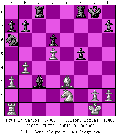 Last move : 0-1 2006 July 8 16:3:37 [Event "FICGS__CHESS__RAPID_B__000003"] [Site "FICGS"] [Date "2006.04.23"] [Round "1"] [White "Agustin,Santos"] [Black "Fillion,Nicolas"] [Result "0-1"] [WhiteElo "1400"] [BlackElo "1640"] 1.d4 Nf6 2.c4 g6 3.Nc3 Bg7 4.e4 d6 5.Bd3 O-O 6.Nge2 e5 7.d5 c6 8.O-O cxd5 9.cxd5 Nbd7 10.Be3 Ng4 11.Bc1 Nc5 12.Bc2 Bd7 13.b4 Na6 14.a3 f5 15.exf5 Bxf5 16.f4 Qb6+ 17.Kh1 Nf2+ 18.Rxf2 Qxf2 19.Bxf5 gxf5 20.fxe5 Rac8 21.Qg1 Qxg1+ 22.Kxg1 Bxe5 23.Be3 Bxc3 0-1 King's Indian : 4.e4 Kingside Castling by player Black (move 5) Kingside Castling by player White (move 8) Player Black won this chess game. Follow this game move after move (download)Bobby Fischer is the greatest Chess player who has ever lived. (Ken Smith) Zum Sieg gelangt man nicht, wenn man gut, sondern nur wenn man besser spielt (Savielly Grigorievitsch Tartakower) La caracteristica mas importante en la posición del Ajedrez es la actividad de las piezas. Esto es absolutamente fundamental en todas las fases del juego: Apertura, Juego Medio y especialmente Finales. La limitación primordial en la actividad de una pieza, es la estructuración de los Peones. (Michael Stean) Votre seul travail dans les ouvertures est d'obtenir un milieu de partie jouable. (Lajos Portish) Imagination is more important than knowledge. Knowledge is limited. Imagination encircles the world. (Albert Einstein)
