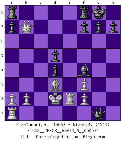 Last move : 0-1 2010 March 2 0:57:33 [Event "FICGS__CHESS__RAPID_A__000074"] [Site "FICGS"] [Date "2010.01.01"] [Round "1"] [White "Piantadosi,Angelo"] [Black "Nizar,Muhammad"] [Result "0-1"] [WhiteElo "1966"] [BlackElo "1911"] 1.e4 c5 2.c3 Nf6 3.e5 Nd5 4.d4 cxd4 5.cxd4 e6 6.Nc3 d6 7.Nxd5 exd5 8.Nf3 Be7 9.Be3 Nc6 10.Bd3 O-O 11.O-O Bg4 12.Qb3 Bxf3 13.gxf3 dxe5 14.Qxb7 Nxd4 15.Bxd4 exd4 16.Rfe1 Bd6 17.Re2 Qg5+ 18.Kf1 Bxh2 19.Ke1 Qg1+ 20.Kd2 Bf4+ 0-1 Sicilian : Alapin's variation (2.c3) Kingside Castling by player Black (move 10) Kingside Castling by player White (move 11) Player Black won this chess game. Follow this game move after move (download)When you don't know what to do, wait for your opponent to get an idea - it's sure to be wrong. (Tarrasch) Es ist peinlich, dass ich nie Weltmeister wurde. Es wäre leicht, Leonid Breschnjew als Ursache vorzuschieben, dessen Apparat den Vorzeigekommunisten Anatoli Karpow in allem unterstützte. Aber Garri Kasparow zum Beispiel, der ebenfalls von den Sowjets unerwünscht war, hat trotz der Widerstände den WM-Titel erobert. (Viktor Kortschnoi) Fischer es el jugador mas fuerte del mundo. De hecho, el jugador mas fuerte que jamas haya existido. (Larry Evans) Si rien de grave n'est détecté lors de l'analyse d'une position, on joue alors le coup. Seconde règle de Blumenfeld. Is not life a hundred times too short to bore ourselves ? (Friedrich Nietzsche)
