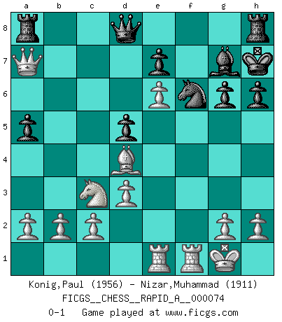 Last move : 0-1 2010 March 28 23:47:5 [Event "FICGS__CHESS__RAPID_A__000074"] [Site "FICGS"] [Date "2010.01.01"] [Round "1"] [White "Konig,Paul"] [Black "Nizar,Muhammad"] [Result "0-1"] [WhiteElo "1956"] [BlackElo "1911"] 1.e4 c5 2.f4 g6 3.Nf3 Bg7 4.Bc4 d6 5.O-O Nf6 6.e5 dxe5 7.fxe5 Nd5 8.Ng5 Be6 9.Nxe6 fxe6 10.Qg4 Qb6 11.Bxd5 exd5 12.Qc8+ Qd8 13.Qxb7 Nd7 14.e6 Nf6 15.Qc6+ Kf8 16.Qxc5 Kg8 17.Nc3 h6 18.d3 Kh7 19.Be3 a5 20.Rae1 Rb8 21.Bd4 Rc8 22.Qa7 Ra8 0-1 Sicilian : Grand Prix attack Kingside Castling by player White (move 5) Player Black won this chess game. Follow this game move after move (download)A player surprised is half beaten. (Proverb) Obwohl ich vom Stil her kaum zu den Priestern der Schachkunst gezählt werde, halte ich Schach doch für eine Kunst. (Tigran Petrosjan) Botvinnik trataba de restarle el misterio al Ajedrez, siempre relacionandolo a situaciones de la vida ordinaria. El gustaba de llamar al Ajedrez un típico problema inexacto similar a aquellos de los cuales la gente siempre tiene que enfrentarse en la vida cotidiana. (Garry Kasparov) La menace est plus forte que l'exécution. (Aaron Nimzovitch) Those parts of the system that you can hit with a hammer (not advised) are called hardware; those program instructions that you can only curse at are called software. (Anonymous)