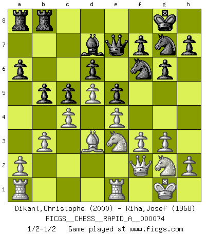 Last move : 1/2-1/2 2010 January 16 19:2:24 [Event "FICGS__CHESS__RAPID_A__000074"] [Site "FICGS"] [Date "2010.01.01"] [Round "1"] [White "Dikant,Christophe"] [Black "Riha,Josef"] [Result "1/2-1/2"] [WhiteElo "2000"] [BlackElo "1968"] 1.d4 Nf6 2.Nf3 g6 3.e3 Bg7 4.Be2 c5 5.c3 O-O 6.Nbd2 b6 7.O-O Bb7 8.b3 d6 9.Bb2 Nbd7 10.c4 Qc7 11.d5 e5 12.e4 Nh5 13.g3 Bc8 14.Nh4 Ndf6 15.Ng2 Bh3 16.Re1 a6 17.f3 Bh6 18.Bf1 Bd7 19.Bd3 b5 20.Nf1 Rfb8 21.Bc1 Bxc1 22.Qxc1 Bh3 23.Nfe3 Qe7 24.Qd2 Ng7 25.Qf2 Bd7 1/2-1/2 King's Indian : East Indian defense Kingside Castling by player Black (move 5) Kingside Castling by player White (move 7) This chess game ended in a draw. Follow this game move after move (download)The chessboard is the world, the pieces are the phenomena of the Universe, the rules of the game are what we call the laws of Nature and the player on the other side is hidden from us. (Thomas Huxley) Es macht mich traurig, wenn ich sehe, dass Golfprofis mehr verdienen als Schachsportler. Obwohl ich davon überzeugt bin, dass wir Schachspieler viel härter trainieren müssen als die Golfer. (Alexandra Kosteniuk) Un mal día en el Ajedrez, es mejor que cualquier buen día en el trabajo. (Anonymous) Le joueur d'Echecs qui veut atteindre le top est obligé de développer son propre credo créatif. Alexeï Stepanovicth Souétine. Il est facile d'écrire des livres ! Ce qui est difficile, c'est de jouer ! (Alexeï Stepanovicth Souétine) Watch your thoughts; they become words. Watch your words; they become actions. Watch your actions; they become habits. Watch your habits; they become character. Watch your character; it becomes your destiny. (Frank Outlaw)