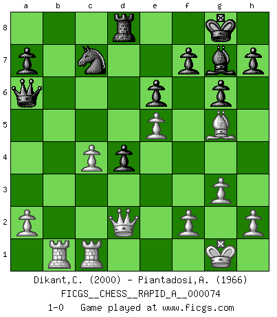 Last move : 1-0 2010 January 29 22:20:8 [Event "FICGS__CHESS__RAPID_A__000074"] [Site "FICGS"] [Date "2010.01.01"] [Round "1"] [White "Dikant,Christophe"] [Black "Piantadosi,Angelo"] [Result "1-0"] [WhiteElo "2000"] [BlackElo "1966"] 1.c4 Nf6 2.Nc3 g6 3.g3 d5 4.cxd5 Nxd5 5.Bg2 c6 6.d4 Nxc3 7.bxc3 Bg7 8.Bf4 O-O 9.e4 Qa5 10.Qd2 Na6 11.Ne2 Rd8 12.O-O Bg4 13.Rfc1 Bxe2 14.Qxe2 c5 15.e5 e6 16.Bxb7 Nc7 17.Bxa8 Rxa8 18.c4 cxd4 19.Rab1 Qa6 20.Qd2 Rd8 21.Bg5 1-0 English Opening Kingside Castling by player Black (move 8) Kingside Castling by player White (move 12) Player White won this chess game. Follow this game move after move (download)The hardest game to win is a won game. (Emanuel Lasker) Privat ist Kortschnoi kein schlechter Mensch, sehr sympathisch. Aber während des Spiels ist er grausam. Er will dich töten. (Miguel Najdorf) Si tu oponente te ofrece un empate, trata de averiguar porque piensa él que esta en una posición peor. (Nigel Short) Même si vous avez un bon coup à faire, regardez toujours s'il n'y en a pas un qui lui soit préférable. (Pedro Damiano) 'preceded by its own quotation yields a falsehood' preceded by its own quotation yields a falsehood. (W. V. O. Quine - Set Theory And Its Logic, 1953)