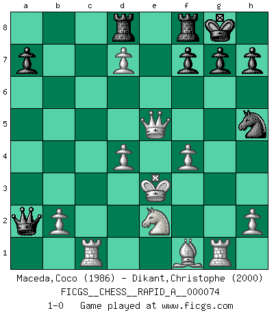 Last move : 1-0 2010 February 28 14:27:39 [Event "FICGS__CHESS__RAPID_A__000074"] [Site "FICGS"] [Date "2010.01.01"] [Round "1"] [White "Maceda,Coco"] [Black "Dikant,Christophe"] [Result "1-0"] [WhiteElo "1986"] [BlackElo "2000"] 1.e4 d5 2.exd5 Nf6 3.d4 Bg4 4.f3 Bf5 5.g4 Bg6 6.c4 e6 7.Qb3 exd5 8.g5 Nh5 9.Qxb7 Nd7 10.Qxd5 Bb4+ 11.Nc3 Qe7+ 12.Kf2 O-O 13.Nge2 Rae8 14.c5 Bd3 15.Kg2 Rd8 16.Qb7 Bxe2 17.Nxe2 Be1 18.Qxc7 Bh4 19.c6 Bxg5 20.cxd7 Bxc1 21.Rxc1 Qg5+ 22.Kf2 Qh4+ 23.Ke3 Qg5+ 24.f4 Qd5 25.Rg1 Qxa2 26.Qe5 1-0 Scandinavian defense Kingside Castling by player Black (move 12) Player White won this chess game. Follow this game move after move (download)The isolated Pawn casts gloom over the entire chessboard. (Aaron Nimzovich) Das Blackmar-Diemer-Gambit verändert den ganzen Menschen! (Emil Joseph Diemer) Evita las multitudes. Haz independientemente tu propio razonamiento. Trata de ser el jugador de Ajedrez, no la pieza de Ajedrez. (Ralph Charell) Il n'y a pas eu de défaite parce que je ne crois pas que cet ordinateur ait jamais existé. IBM a triché en refusant d'imprimer les modes de recherche de la machine. C'est évident, pendant le match, des coups décisifs ont été joués par des êtres humains. Aujourd'hui, les meilleurs spécialistes en informatique ne peuvent toujours pas expliquer comment Deep-Blue a pu jouer contre la logique des ordinateurs. IBM a gagné une guerre de communication, mais ils sont incapables de prouver que l'ordinateur a gagné tout seul. (Garry Kasparov) Shallow men believe in luck. Strong men belive in cause and effect. (Ralph Waldo Emerson)