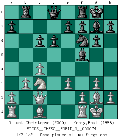 Last move : 1/2-1/2 2010 February 16 19:8:30 [Event "FICGS__CHESS__RAPID_A__000074"] [Site "FICGS"] [Date "2010.01.01"] [Round "1"] [White "Dikant,Christophe"] [Black "Konig,Paul"] [Result "1/2-1/2"] [WhiteElo "2000"] [BlackElo "1956"] 1.c4 Nf6 2.Nc3 g6 3.g3 Bg7 4.Bg2 c5 5.e3 d6 6.Nge2 Nc6 7.O-O O-O 8.d4 cxd4 9.Nxd4 Bg4 10.Nxc6 bxc6 11.Qa4 Bd7 12.Qc2 Rb8 13.b3 Bf5 1/2-1/2 English Opening Kingside Castling by player White (move 7) Kingside Castling by player Black (move 7) This chess game ended in a draw. Follow this game move after move (download)An attack on the wing should be met by play in the center. (Nimzovitch) Wenn man heute mit 14 Jahren noch kein GM ist, kann man es vergessen. (Viswanathan Anand) No es tiempo de jugar al Ajedrez cuando la casa esta en llamas. (Proverbio Italiano) Il a essayé de se convaincre qu'il pourrait empêcher toutes les erreurs et ne jamais perdre. L'horreur ! Gary Kasparov au sujet de Robert Fischer. He is a liar. I just don't know what the lie is yet. (Horatio Caine, C.S.I. Miami)