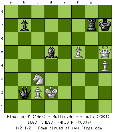 Last move : 1/2-1/2 2010 January 9 10:17:4 [Event "FICGS__CHESS__RAPID_A__000074"] [Site "FICGS"] [Date "2010.01.01"] [Round "1"] [White "Riha,Josef"] [Black "Muller,Henri-Louis"] [Result "1/2-1/2"] [WhiteElo "1968"] [BlackElo "2001"] 1.e4 c5 2.Nf3 d6 3.d4 cxd4 4.Nxd4 Nf6 5.Nc3 a6 6.Bg5 e6 7.f4 Qb6 8.Nb3 Be7 9.Be2 Nbd7 10.Qd3 h6 11.Bxf6 Bxf6 12.O-O-O Be7 13.h4 Nc5 14.Qg3 Nxb3+ 15.axb3 O-O 16.Qf3 Bd7 17.g4 a5 18.g5 a4 19.bxa4 Bxa4 20.gxh6 Bf6 21.Rhg1 Bc6 22.hxg7 Ra1+ 23.Kd2 Rxd1+ 24.Rxd1 Bxg7 25.Qe3 Qxb2 26.Rg1 Kh8 27.Rxg7 Kxg7 28.f5 exf5 29.Qg5+ Kh8 30.Qf6+ Kg8 31.exf5 Kh7 32.Qe7 Rg8 33.Qxf7+ Rg7 34.Qh5+ Kg8 35.Bc4+ d5 36.Bxd5+ Bxd5 37.Qe8+ Kh7 38.Qh5+ 1/2-1/2 Sicilian : Najdorf, 7...Qb6 Queenside Castling by player White (move 12) Kingside Castling by player Black (move 15) This chess game ended in a draw. Follow this game move after move (download)Chess demands total concentration. (Bobby Fischer) Wenn du gegen Bobby spielst, ist es keine Frage von gewinnen oder verlieren. Es ist eine Frage des Überlebens. (Boris Vassilievich Spassky) Existen dos clases de sacrificios: los correctos y los míos. (Mikhail Tal) Les échecs sont utiles à l'exercice de la faculté de penser et à celle de l'imagination. Car nous devons posséder une méthode élaborée pour atteindre des buts partout où nous devons conduire notre raison. (Leibnitz) The project of the man are lower than those of the sky. (Chinese proverb)