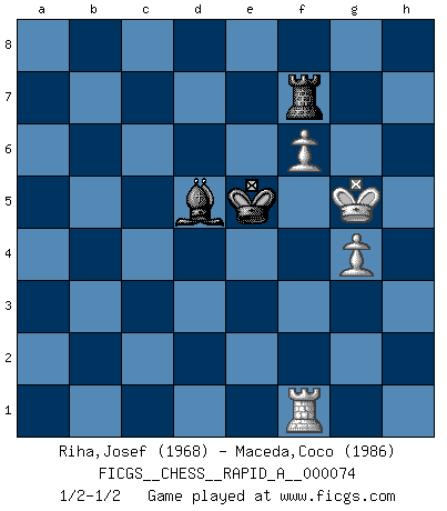 Last move : 1/2-1/2 2010 March 27 9:0:27 [Event "FICGS__CHESS__RAPID_A__000074"] [Site "FICGS"] [Date "2010.01.01"] [Round "1"] [White "Riha,Josef"] [Black "Maceda,Coco"] [Result "1/2-1/2"] [WhiteElo "1968"] [BlackElo "1986"] 1.d4 d5 2.c4 c6 3.Nc3 Nf6 4.Nf3 e6 5.Bg5 dxc4 6.e4 b5 7.e5 h6 8.Bh4 g5 9.Nxg5 hxg5 10.Bxg5 Nbd7 11.exf6 Bb7 12.g3 c5 13.d5 Qb6 14.Bg2 O-O-O 15.O-O b4 16.Na4 Qb5 17.a3 exd5 18.axb4 cxb4 19.Be3 Nc5 20.Qg4+ Rd7 21.Nxc5 Bxc5 22.Bxc5 Qxc5 23.Rfe1 Rhd8 24.Re7 Kc7 25.Rae1 Bc6 26.Qg7 c3 27.bxc3 Qxc3 28.Bh3 Rxe7 29.Rxe7+ Kb6 30.Qxf7 Ra8 31.Bf1 d4 32.Qh5 Qf3 33.Qxf3 Bxf3 34.Re5 Kc6 35.h4 a5 36.f7 Rf8 37.Bc4 d3 38.Bxd3 Bd5 39.Bc2 b3 40.Bxb3 Bxb3 41.Rxa5 Rxf7 42.Ra3 Bd5 43.f4 Kd6 44.Kf2 Rh7 45.Ra6+ Kc5 46.f5 Kd4 47.g4 Rxh4 48.Kg3 Rh1 49.Kf4 Rf1+ 50.Kg5 Rg1 51.Ra3 Rg2 52.Ra4+ Ke5 53.Rf4 Ra2 54.f6 Ra7 55.Rf1 Rf7 1/2-1/2 QGD Slav defense Queenside Castling by player Black (move 14) Kingside Castling by player White (move 15) 10 pieces endgame at move 40 : White KRPPPP , Black KRBP WHITE : King + 1 Rook 4 Pawns BLACK : King + 1 Rook 1 Bishop 1 Pawn 9 pieces endgame at move 41 : White KRPPPP , Black KRB WHITE : King + 1 Rook 4 Pawns BLACK : King + 1 Rook 1 Bishop 8 pieces endgame at move 41 : White KRPPP , Black KRB WHITE : King + 1 Rook 3 Pawns BLACK : King + 1 Rook 1 Bishop 7 pieces endgame at move 47 : White KRPP , Black KRB WHITE : King + 1 Rook 2 Pawns BLACK : King + 1 Rook 1 Bishop This chess game ended in a draw. Follow this game move after move (download)Pawns: they are the soul of this game, they alone form the attack and defense. (Philidor) Immer nach dem besten Zug zu suchen ist ziemlich unpraktisch. (Nigel Short) Un buen sacrificio es aquel que aunque no sea necesariamente sólido, deja a tu oponente aturdido y confuso. (Rudolph Spielmann) Dieu déplace le joueur, et celui-ci la pièce. Quel Dieu derrière Dieu commence donc la trame ? Arturo Perez-Reverte (prix de littérature policière 1993). Locking firmely the window serves nothing, only small thiefs pass through there, the big thiefs enter through the front door. (Luc-Olivier Leclerc)