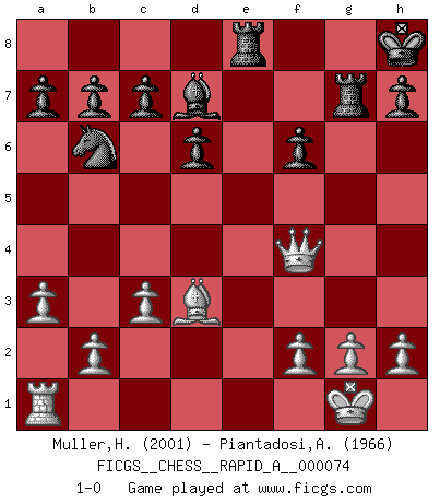 Last move : 1-0 2010 January 26 21:41:14 [Event "FICGS__CHESS__RAPID_A__000074"] [Site "FICGS"] [Date "2010.01.01"] [Round "1"] [White "Muller,Henri-Louis"] [Black "Piantadosi,Angelo"] [Result "1-0"] [WhiteElo "2001"] [BlackElo "1966"] 1.e4 Nf6 2.e5 Nd5 3.d4 d6 4.Nf3 e6 5.Bc4 Nb6 6.Bd3 Nc6 7.O-O Be7 8.a3 O-O 9.Nc3 Bd7 10.Qe2 f6 11.exf6 Bxf6 12.Ne4 Nxd4 13.Nxd4 Bxd4 14.Bg5 Qe8 15.c3 Bf6 16.Nxf6+ gxf6 17.Bh6 Rf7 18.Qf3 Bc6 19.Qg4+ Kh8 20.Rfe1 Re7 21.Rxe6 Bd7 22.Bg7+ Rxg7 23.Rxe8+ Rxe8 24.Qf4 1-0 Alekhine's defense : Modern variation Kingside Castling by player White (move 7) Kingside Castling by player Black (move 8) Player White won this chess game. Follow this game move after move (download)Different people feel differently about resigning. (Bobby Fischer) Ohne ihre Erfolge schmälern zu wollen würde ich sagen Petrosian, Spassky und Karpov verdanken ihre Siege ihren Trainern - Boleslavsky, Bondarevsky und Furman. (Mikhail Moiseyevich Botvinik) Tu cuerpo tiene que estar en óptima condición. Tu Ajedrez se deteriora como lo hace tu cuerpo. No puedes separar la mente y el cuerpo. (Bobby Fischer) La solitude du joueur d'Echecs à l'approche du mat est semblable à celle du condamné. (Francis Szpiner) O divine art of subtlety and secrecy! Through you we learn to be invisible, through you inaudible and hence we can hold the enemy's fate in our hands. (Sun Tzu)