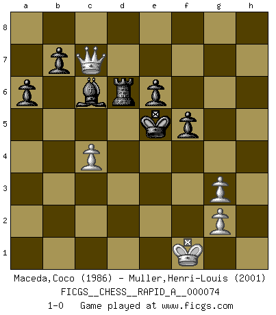 Last move : 1-0 2010 March 19 16:19:55 [Event "FICGS__CHESS__RAPID_A__000074"] [Site "FICGS"] [Date "2010.01.01"] [Round "1"] [White "Maceda,Coco"] [Black "Muller,Henri-Louis"] [Result "1-0"] [WhiteElo "1986"] [BlackElo "2001"] 1.e4 c5 2.Nf3 d6 3.d4 cxd4 4.Nxd4 Nf6 5.Nc3 a6 6.Bg5 e6 7.f4 Qb6 8.Qd2 Qxb2 9.Rb1 Qa3 10.e5 dxe5 11.fxe5 Nfd7 12.Ne4 h6 13.Bh4 Qxa2 14.Rd1 Qd5 15.Qe3 Qxe5 16.Be2 Bc5 17.Bg3 Bxd4 18.Rxd4 Qa5+ 19.Rd2 O-O 20.Bd6 Rd8 21.Qg3 Qf5 22.Be5 Qg6 23.Qh4 Nc6 24.Bh5 Qf5 25.Bxg7 Nc5 26.Nxc5 Kxg7 27.Rf1 Qe5+ 28.Ne4 Qa1+ 29.Rd1 Rxd1+ 30.Bxd1 Qe5 31.Rf6 Bd7 32.Qxh6+ Kg8 33.Rf4 f5 34.Rh4 Rd8 35.Rh3 Qxe4+ 36.Kf1 Qe5 37.Rg3+ Qxg3 38.hxg3 Kf7 39.Qh7+ Kf6 40.Bf3 Ke5 41.Bxc6 Bxc6 42.Qc7+ Rd6 43.c4 1-0 Sicilian : Najdorf, 7...Qb6 Kingside Castling by player Black (move 19) Player White won this chess game. Follow this game move after move (download)The most important feature of the Chess position is the activity of the pieces. This is absolutely fundamental in all phases of the game: Opening, Middlegame and especially Endgame. The primary constraint on a piece's activity is the Pawn structure. (Michael Stean) Der vorletzte Fehler gewinnt. (Savielly Grigorievitsch Tartakower) No soy una persona materialista y por eso, no resiento la falta o pérdida del dinero. La ausencia de cosas mundanas carece de importancia. Ya que el Ajedrez es una forma en la que puedo ser tan materialista como yo desee sin tener la necesidad de vender mi alma. (Jamie Walter Adams) Ce qui est bien, c'est d'avoir tout un tas de pièces en prise : l'adversaire ne peut en prendre qu'une à la fois. Cité par Thierry Audin. Without deviation from the norm, progress is not possible. (Frank Zappa)