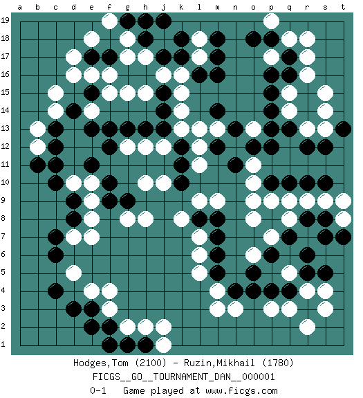 Last move : 0-1 2007 February 17 19:7:12 [Event "FICGS__GO__TOURNAMENT_DAN__000001"] [Site "FICGS"] [Date "2006.10.14"] [Round "1"] [Black "Hodges,Tom"] [White "Ruzin,Mikhail"] [Result "0-1"] [Rating 1 "2100"] [Rating 2 "1780"] 1.r5 d16 2.c4 q3 3.p4 p3 4.o4 n3 5.n4 m3 6.r10 q9 7.q10 o9 8.p10 q5 9.q4 r4 10.r3 s4 11.r6 r2 12.s5 s3 13.p8 p9 14.q16 m4 15.m5 l5 16.m6 o6 17.p6 o8 18.o5 p7 19.q7 q8 20.r8 r9 21.s8 s9 22.s10 t8 23.t7 t9 24.s7 l6 25.m7 o10 26.p12 e4 27.e3 f3 28.d3 f4 29.c6 q14 30.p14 q15 31.p15 r16 32.q17 r17 33.q13 r13 34.r12 s13 35.s12 s15 36.m17 m9 37.n11 o13 38.p13 o11 39.o12 n12 40.m12 l7 41.m8 l9 42.l8 k8 43.f17 f16 44.g16 f15 45.e17 d17 46.c11 g15 47.h16 h15 48.j15 j16 49.j17 k16 50.k17 l17 51.l16 k15 52.j14 k14 53.j13 k13 54.k12 j12 55.h13 h12 56.g13 l12 57.k11 m13 58.n13 l11 59.k10 g12 60.f13 j10 61.f12 h10 62.d14 l18 63.m14 l13 64.m16 h17 65.h18 g17 66.k18 g18 67.m18 e7 68.d8 e8 69.d9 c14 70.c13 c15 71.f9 e9 72.f10 e10 73.e11 d10 74.c10 g8 75.g9 h8 76.t13 s14 77.g19 f19 78.j19 e18 79.f2 g2 80.e2 b13 81.c12 b12 82.b11 d7 83.c7 q18 84.p18 p17 85.p16 r18 86.h19 p19 87.o18 d5 88.g1 h2 89.h1 j1 90.f1 j2 91.e15 e14 92.e13 e16 0-1 Here are the names of the openings (joseki) played in the four corners : Corner q4 : r5 q3 Mokuhazushi (Waemok, Wai`mu`) 5-3 Point. The mokuhazushi (5-3) point was popular in the Edo period in Japan (1600 - 1867). It emphasizes influence; territorially, it is inferior to the 3-4 point. Komoku Kakari. White 2 is the standard approach because of its solidity and stability. Corner d4 : c4 e4 Komoku (Somok, Xiao~mu`) 3-4 Point. The komoku (3-4) point is the traditional corner enclosure move.. Ikken Takagakari (Hankan Nop'dakeolch'im, Yi Gaogua`jiao~, 1-Space High Approach). The 5-4 approach move has become more popular in modern times, as modern Go emphasizes speed and influence. Corner d16 : d16 f17 Hoshi (Hwajeom, Seongjeom, Xingwei`) 4-4 Point. The star or hoshi (4-4) point, emphasizing influence at the potential expense of territory. Ikken Kakari (Hankan Keolch'im, Yi Gua`jiao~, 1-Space Low Approach). Black 2 is the standard approach move to the 4-4. Player White won this Go (weiqi, baduk) game. Follow this game move after move (download)Add one stone, then sacrifice both. (Anonymous) Once you start thinking you have nothing left to learn, you have everything to learn. (Steve Badget)