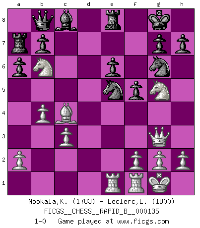 Last move : 1-0 2010 February 14 4:58:5 [Event "FICGS__CHESS__RAPID_B__000135"] [Site "FICGS"] [Date "2010.01.01"] [Round "1"] [White "Nookala,Kamesh"] [Black "Leclerc,Luc-Olivier"] [Result "1-0"] [WhiteElo "1783"] [BlackElo "1800"] 1.e4 c6 2.c3 d5 3.e5 c5 4.d4 Nc6 5.Be2 Qb6 6.dxc5 Qxc5 7.b4 Qb6 8.Qxd5 e6 9.Qe4 f5 10.Qf4 Nge7 11.Nf3 Ng6 12.Qg3 Qc7 13.Na3 a6 14.Nc4 Be7 15.Be3 O-O 16.Bb6 Qb8 17.Bd3 Bd8 18.O-O Bxb6 19.Nxb6 Ra7 20.Bc4 Ncxe5 21.Ng5 Re8 22.Rae1 1-0 Caro-Kann defense Kingside Castling by player Black (move 15) Kingside Castling by player White (move 18) Player White won this chess game. Follow this game move after move (download)Chess teaches you to control the initial excitement you feel when you see something that looks good and it trains you to think objectively when you're in trouble. (Stanley Kubrick) Um sich vor der Gefahr einer Erkältung zu schützen, sorge der wanderlustige König beizeiten für ein brauchbares Versteck. (Aaron Nimzowitsch) Yo he agregado estos principios a la ley: pongan los Caballos en acción antes de que los dos Alfiles sean desarrollados. (Emanuel Lasker) Aidez vos pièces, elles vous aideront. (Paul Morphy) There are three kinds of lies: lies, damned lies and statistics. (Mark Twain)