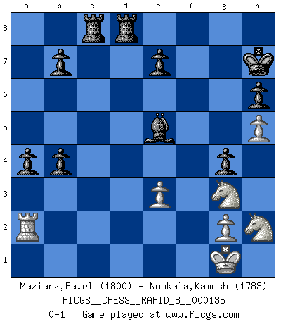 Last move : 0-1 2010 January 5 17:3:59 [Event "FICGS__CHESS__RAPID_B__000135"] [Site "FICGS"] [Date "2010.01.01"] [Round "1"] [White "Maziarz,Pawel"] [Black "Nookala,Kamesh"] [Result "0-1"] [WhiteElo "1800"] [BlackElo "1783"] 1.e4 c5 2.b4 cxb4 3.d4 Nf6 4.e5 Nd5 5.Bc4 Nb6 6.Bb3 a5 7.Nf3 a4 8.Bxf7+ Kxf7 9.Ng5+ Kg8 10.Qh5 g6 11.Qf3 Qe8 12.O-O Nc6 13.Be3 h6 14.Nh3 Qf7 15.Qxf7+ Kxf7 16.Nf4 g5 17.Nh5 d6 18.Nd2 dxe5 19.dxe5 Nd5 20.Rae1 Kg6 21.Ng3 Be6 22.Nf3 Nxe3 23.Rxe3 Bxa2 24.h4 Bg7 25.Rd1 Rhd8 26.Rde1 g4 27.h5+ Kh7 28.Nh2 Nd4 29.Rc1 Rac8 30.Ra1 Nxc2 31.Rxa2 Nxe3 32.fxe3 Bxe5 0-1 Sicilian : wing gambit Kingside Castling by player White (move 12) Player Black won this chess game. Follow this game move after move (download)Many Chess players were surprised when after the game, Fischer quietly explained: 'I had already analyzed this possibility' in a position which I thought was not possible to foresee from the opening. (Mikhail Tal) Kleine Schachspieler machen Mist, und große Schachspieler machen Mist, aber große machen weniger Mist. (Fritz Sämisch) No hay un Gran Maestro de Ajedrez que sea normal; solo se diferencían ellos por la magnitud de su locura. (Viktor Korchnoi) A ce moment-là, je menaçais de comprendre la position ! (Clément L'Heureux) All men can see these tactics whereby I conquer, but what none can see is the strategy out of which victory is evolved. (Sun Tzu)