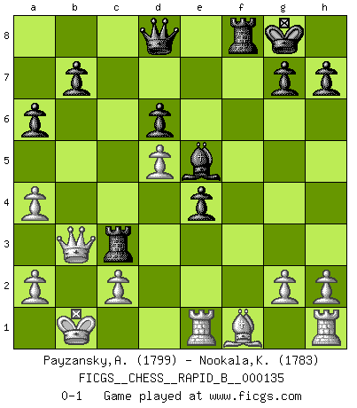 Last move : 0-1 2010 January 4 16:51:14 [Event "FICGS__CHESS__RAPID_B__000135"] [Site "FICGS"] [Date "2010.01.01"] [Round "1"] [White "Payzansky,Aleksey"] [Black "Nookala,Kamesh"] [Result "0-1"] [WhiteElo "1799"] [BlackElo "1783"] 1.e4 c5 2.Nf3 d6 3.d4 cxd4 4.Nxd4 Nf6 5.Nc3 a6 6.Be3 e5 7.Nb3 Be6 8.Qd2 Be7 9.O-O-O Ng4 10.Kb1 Nd7 11.Nd5 Bxd5 12.exd5 O-O 13.f4 Nxe3 14.Qxe3 Bf6 15.Nd2 exf4 16.Qxf4 Nc5 17.Ne4 Be5 18.Qf3 Na4 19.b3 f5 20.bxa4 fxe4 21.Qb3 Rc8 22.Re1 Rc3 0-1 Sicilian : Najdorf, Byrne (English) attack Queenside Castling by player White (move 9) Kingside Castling by player Black (move 12) Player Black won this chess game. Follow this game move after move (download)Whoever sees no other aim in the game than that of giving checkmate to one's opponent will never become a good Chess player. (Euwe) Die Leute spielen gegen mich seit 15 Jahren unter Ihren Möglichkeiten. (Robert James Fischer) Si el ingenio solamente fuese necesario para lucirse, las mujeres serían las mejores jugadoras de Ajedrez del mundo. (Albin) Vous m'avez demandé de vous exposer quel est le fondement de la prière. Je ne fais que préparer les pièces du jeu sur la table... Nous sera-t-il permis d'en adopter les règles et si nous les appliquons scrupuleusement nous ne tarderons pas à faire mat le Roi divin ! Il ne pourra échapper à nos mains. (Sainte Thérèse d'Avila, Chemin de perfection) To steal ideas from one person is plagiarism. To steal from many is research. (Unknown)