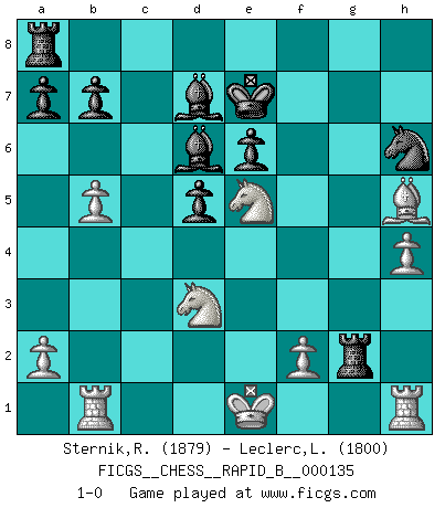 Last move : 1-0 2010 February 16 13:36:27 [Event "FICGS__CHESS__RAPID_B__000135"] [Site "FICGS"] [Date "2010.01.01"] [Round "1"] [White "Sternik,Ryszard"] [Black "Leclerc,Luc-Olivier"] [Result "1-0"] [WhiteElo "1879"] [BlackElo "1800"] 1.e4 c6 2.d4 d5 3.e5 c5 4.dxc5 e6 5.Qg4 h5 6.Qf4 Bxc5 7.Bd3 Qb6 8.c3 Bd7 9.b4 Be7 10.Be3 g5 11.Bxb6 gxf4 12.Bd4 Nc6 13.b5 Nxd4 14.cxd4 f6 15.Ne2 fxe5 16.dxe5 Nh6 17.Nxf4 Bc5 18.Bg6+ Kd8 19.Nd2 Bd4 20.Rb1 Bxe5 21.Nd3 Bd6 22.Nf3 Rg8 23.Bxh5 Rxg2 24.h4 Ke7 25.Nfe5 1-0 Caro-Kann : Advance variation Player White won this chess game. Follow this game move after move (download)One doesn't have to play well, it's enough to play better than your opponent. (Siegbert Tarrasch) Ich verlor meine Bürgerrechte, mein Gehalt wurde mir nicht mehr bezahlt und ich wurde zensiert und durfte nicht mehr ins Ausland reisen. [nach dem Match Fischer-Taimanov 6:0] (Mark Taimanov) Me gusta decir que Bobby Fischer fue el mejor jugador que jamás haya existido. Pero lo que hizo de Fischer un genio, fue su habilidad de mezclar una frescura y pragmatismo Americano con ideas Rusas acerca de la estrategia. (Bruce Pandolfini) Lorsque vous vous retrouvez devant une position atroce, ne tendez pas un ultime piège dérisoire avec l'intention d'abandonner si l'adversaire le déjoue ! Faites-vous plutôt un devoir de résister comme si votre vie en dépendait. Jouez le coup qui vous déplairait au centuple si vous étiez dans la peau de votre tortionnaire ! If you work for a living, why do you kill yourself working ? (Tuco to a chicken in The Good, The Bad and The Ugly)