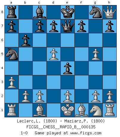 Last move : 1-0 2010 January 10 23:53:58 [Event "FICGS__CHESS__RAPID_B__000135"] [Site "FICGS"] [Date "2010.01.01"] [Round "1"] [White "Leclerc,Luc-Olivier"] [Black "Maziarz,Pawel"] [Result "1-0"] [WhiteElo "1800"] [BlackElo "1800"] 1.f4 g5 2.fxg5 e5 3.d4 Nc6 4.d5 Na5 5.Nc3 Bb4 6.Qd3 Qe7 7.a3 e4 8.Qd4 Bxc3+ 9.Qxc3 b6 10.Qxh8 1-0 Bird : Hobbs gambit Player White won this chess game. Follow this game move after move (download)One bad move nullifies forty good ones. (Horowitz) Der beste Spieler in einem Turnier gewinnt es nie. Er landet auf Platz zwei oder drei. (Siegbert Tarrasch) Si yo gano un torneo, yo lo gano por mí mismo. Yo hago las jugadas. Nadie me ayuda. (Bobby Fischer) J'ai toujours senti une vague pitié pour l'homme qui ne connaît rien aux échecs, tout comme j'en aurais pour un homme ignorant de l'amour. Les Echecs, comme la musique ou comme l'amour, ont le pouvoir de rendre heureux. (Siegbert Tarrasch) Vladimir Ras-Putin is still alive... He is also a good actor, I saw him in the Lord of the Rings. (Rodolfo d'Ettorre)
