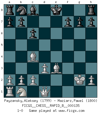 Last move : 1-0 2010 January 2 15:29:29 [Event "FICGS__CHESS__RAPID_B__000135"] [Site "FICGS"] [Date "2010.01.01"] [Round "1"] [White "Payzansky,Aleksey"] [Black "Maziarz,Pawel"] [Result "1-0"] [WhiteElo "1799"] [BlackElo "1800"] 1.e4 e5 2.Nf3 d5 3.Nxe5 dxe4 4.Bc4 Nh6 5.d3 c6 6.Bxh6 Qa5+ 7.Bd2 Qxe5 8.O-O Bd6 9.f4 exf3 10.Re1 Bc5+ 11.Kf1 Be3 12.Rxe3 fxg2+ 13.Kxg2 Qxe3 14.Bxe3 1-0 QP counter-gambit (elephant gambit) Kingside Castling by player White (move 8) Player White won this chess game. Follow this game move after move (download)Chess is a sea in which a gnat may drink and an elephant may bathe. (Hindu proverb) Zeige mir drei Eröffnungsvarianten und ich beweise dir, dass zwei davon inkorrekt sind. (Emanuel Lasker) Puntos débiles o agujeros en la posición de tu oponente deben de ser ocupados por piezas, no Peones. (Siegbert Tarrasch) Des combinaisons [dans le jeu d'échecs] pareilles à des mélodies. Je crois entendre pour ainsi dire la musique des coups... (Vladimir Nabokov) The various flowers seem good to different people. (Chinese proverb)