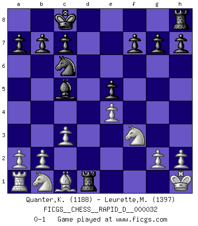 Last move : 0-1 2010 January 10 21:8:12 [Event "FICGS__CHESS__RAPID_D__000032"] [Site "FICGS"] [Date "2010.01.01"] [Round "1"] [White "Quanter,Kirsty"] [Black "Leurette,Marc-Antoine"] [Result "0-1"] [WhiteElo "1188"] [BlackElo "1397"] 1.e4 e5 2.c3 d5 3.Bb5+ Bd7 4.Bxd7+ Qxd7 5.f3 dxe4 6.fxe4 Nf6 7.d3 Nc6 8.Nf3 O-O-O 9.O-O Bc5+ 10.Kh1 Nxe4 11.dxe4 Qxd1 12.Rxd1 Rxd1+ 0-1 Variation Lopez Opening : Lopez Opening Queenside Castling by player Black (move 8) Kingside Castling by player White (move 9) Player Black won this chess game. Follow this game move after move (download)Pawns are born free, yet they are everywhere in chains. (Rick Kennedy) Dass jemand wie Surab Asmaiparaschwili, der selbst Elopunkte gekauft hat , Vize-Präsident der Fide werden konnte, sagt schon einges über den Zustand dieser Organisation aus. (Joel Lautier) Una de estas pequeñas movidas modestas pudieran ser mas molestas a tu oponente que la amenaza mas grande. (Siegbert Tarrasch) L'action d'une oeuvre littéraire se déroule sur un champ de bataille. Les masques et les types du drame moderne correspondent aux pièces du jeu d'échecs. L'intrigue correspond aux coups et aux gambits, c'est à dire aux techniques du jeu telles qu'utilisées et interprétées par les joueurs. Les tactiques et les péripéties [mouvements] correspondent aux coups exécutés par l'adversaire. (Viktor Shklovsky) Programmer - an organism that turns coffee into software. (Anonymous)