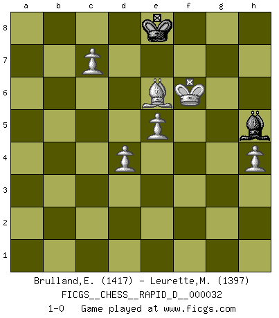 Last move : 1-0 2010 January 18 18:34:49 [Event "FICGS__CHESS__RAPID_D__000032"] [Site "FICGS"] [Date "2010.01.01"] [Round "1"] [White "Brulland,Emmanuel"] [Black "Leurette,Marc-Antoine"] [Result "1-0"] [WhiteElo "1417"] [BlackElo "1397"] 1.c4 e5 2.Nc3 Nf6 3.d3 d5 4.cxd5 Nxd5 5.Nf3 Nc6 6.g3 Bb4 7.Bd2 Bxc3 8.bxc3 Bd7 9.c4 Nf6 10.Bg2 Qe7 11.O-O O-O 12.e4 Nd4 13.Nxd4 exd4 14.Qb3 b6 15.a4 Rab8 16.Rfc1 c5 17.Bf4 Rbc8 18.a5 Nh5 19.Bd2 bxa5 20.Rxa5 Bg4 21.f3 Be6 22.Qa3 Rc7 23.Ra1 Ra8 24.g4 Nf6 25.Bf4 Rb7 26.Qxc5 Qxc5 27.Rxc5 Rc8 28.Rxc8+ Bxc8 29.Be5 Rd7 30.Bh3 Rd8 31.Rxa7 h6 32.Ra8 Kf8 33.Bf1 Ke7 34.Bxd4 Bb7 35.Rxd8 Kxd8 36.Bxf6+ gxf6 37.Kf2 Ke7 38.d4 Kd6 39.Ke3 Ba6 40.Be2 Ke6 41.c5 Bb7 42.Bc4+ Ke7 43.f4 Kd7 44.Bxf7 Ke7 45.Bd5 Bc8 46.Kf3 Kd7 47.h4 Ke7 48.e5 fxe5 49.fxe5 Kd7 50.Kf4 Ke7 51.g5 hxg5+ 52.Kxg5 Kf8 53.Kf6 Bg4 54.Be6 Bh5 55.c6 Ke8 56.c7 1-0 English Opening Kingside Castling by player White (move 11) Kingside Castling by player Black (move 11) 10 pieces endgame at move 49 : White KBPPPPP , Black KBP WHITE : King + 1 Bishop 5 Pawns BLACK : King + 1 Bishop 1 Pawn 9 pieces endgame at move 51 : White KBPPPP , Black KBP WHITE : King + 1 Bishop 4 Pawns BLACK : King + 1 Bishop 1 Pawn 8 pieces endgame at move 52 : White KBPPPP , Black KB WHITE : King + 1 Bishop 4 Pawns BLACK : King + 1 Bishop Player White won this chess game. Follow this game move after move (download)Chess is played with the mind and not with the hands ! (Renaud and Kahn) Wer mein Gambit spielt, muß bereit sein, alle Brücken hinter sich abzubrechen. Es verändert den ganzen Menschen. Es wirkt wie ein Zauberstab und fördert verkümmerte, gute Charakter- eigenschaften wieder zu Tage. (Emil Joseph Diemer) La batalla por la última verdad nunca sera ganada. Y es por eso que el Ajedrez es tan fascinante. (Hans Kmoch) Les écrivains ont utilisé les échecs pour analyser les côtés extrêmes de la nature humaine. Dans ce cadre, les échecs offrent un champ d'expérimentation idéal. Mais on pourrait faire la même chose avec la peinture. Et là, en vous référant à Van Gogh, vous ne tirerez pas de conclusion définitive sur les peintres. (Gary Kasparov) As a goal marker shodan is important. As a destination it is a poor place to stop. (Thomas Tamayo)
