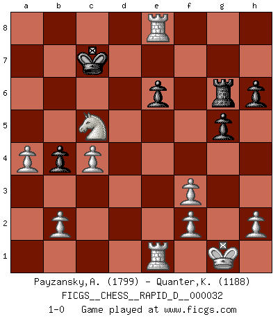 Last move : 1-0 2010 February 13 20:16:58 [Event "FICGS__CHESS__RAPID_D__000032"] [Site "FICGS"] [Date "2010.01.01"] [Round "1"] [White "Payzansky,Aleksey"] [Black "Quanter,Kirsty"] [Result "1-0"] [WhiteElo "1799"] [BlackElo "1188"] 1.e4 e5 2.Nf3 Nc6 3.Bb5 Nge7 4.c3 a6 5.Ba4 b5 6.Bb3 d5 7.exd5 Nxd5 8.O-O Be6 9.Re1 Qf6 10.d4 exd4 11.Bxd5 Kd7 12.Bxc6+ Kxc6 13.Nxd4+ Kb7 14.Nxe6 fxe6 15.Qf3+ Qxf3 16.gxf3 Re8 17.Bf4 h6 18.a4 b4 19.c4 c5 20.Nd2 g5 21.Be5 Rg8 22.Ne4 Be7 23.Bd6 Kc6 24.Rad1 Bxd6 25.Rxd6+ Kc7 26.Rxa6 Rg6 27.Nxc5 Kc8 28.Ra8+ Kc7 29.Rxe8 1-0 Ruy Lopez : Cozio defense Kingside Castling by player White (move 8) Player White won this chess game. Follow this game move after move (download)If one piece is badly posted, the whole game is bad. (Tarrasch) Garry Kasparov war erst in der Großmeister-Organisation GMA, dann in der Profischach-Vereinigung PCA, zum Schluss kehrte er wieder in den Schoß der FIDE zurück. Aber gut, manche Leute sind flexibel (Viswanathan Anand) Te sientas frente a un tablero y repentinamente tu corazón brinca. Tu mano tiembla al tomar una pieza y moverla. Pero lo que el Ajedrez te enseña es que tu debes permanecer ahí con calma y pensar de que si realmente es una buena idea o de que si hay otras ideas mejores. (Stanley Kubrick) RxDa4 pat (...) There are two types of people in this world, good and bad. The good sleep better, but the bad seem to enjoy the waking hours much more. (Woody Allen)