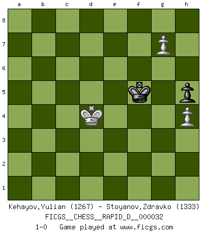 Last move : 1-0 2010 January 19 21:33:38 [Event "FICGS__CHESS__RAPID_D__000032"] [Site "FICGS"] [Date "2010.01.01"] [Round "1"] [White "Kehayov,Yulian"] [Black "Stoyanov,Zdravko"] [Result "1-0"] [WhiteElo "1267"] [BlackElo "1333"] 1.d4 d5 2.Bf4 e6 3.Nf3 h6 4.e3 a6 5.Be2 Nf6 6.O-O Bd6 7.Ne5 Nbd7 8.Nc3 O-O 9.Qd3 Bxe5 10.dxe5 Ne8 11.e4 dxe4 12.Nxe4 b5 13.Nc5 Qe7 14.Be3 c6 15.Nxd7 Bxd7 16.a3 f6 17.b4 fxe5 18.Bc5 Qf7 19.Bxf8 Kxf8 20.Rad1 Nf6 21.Qd6+ Qe7 22.Qxe5 a5 23.c3 axb4 24.axb4 Nd5 25.Rc1 c5 26.bxc5 Qxc5 27.c4 bxc4 28.Bxc4 Ra5 29.Rfd1 Nb6 30.Qxc5+ Rxc5 31.Bxe6 Rxc1 32.Rxc1 Bxe6 33.Rc6 Ke7 34.Rxb6 Kf6 35.Rxe6+ Kxe6 36.g3 Kf5 37.Kg2 g5 38.Kf3 g4+ 39.Ke3 Ke5 40.f3 gxf3 41.Kxf3 Kf5 42.g4+ Kg5 43.Kg3 h5 44.h4+ Kg6 45.g5 Kf5 46.Kf2 Ke5 47.Ke3 Kf5 48.Kd4 Kf4 49.g6 Kf5 50.g7 1-0 Queen's pawn, Mason variation Kingside Castling by player White (move 6) Kingside Castling by player Black (move 8) 10 pieces endgame at move 32 : White KRPPP , Black KBNPP WHITE : King + 1 Rook 3 Pawns BLACK : King + 1 Bishop 1 Knight 2 Pawns 9 pieces endgame at move 34 : White KRPPP , Black KBPP WHITE : King + 1 Rook 3 Pawns BLACK : King + 1 Bishop 2 Pawns 8 pieces endgame at move 35 : White KRPPP , Black KPP WHITE : King + 1 Rook 3 Pawns BLACK : King + 2 Pawns 7 pieces endgame at move 35 : White KPPP , Black KPP WHITE : King + 3 Pawns BLACK : King + 2 Pawns 6 pieces endgame at move 40 : White KPP , Black KPP WHITE : King + 2 Pawns BLACK : King + 2 Pawns 5 pieces endgame at move 41 : White KPP , Black KP WHITE : King + 2 Pawns BLACK : King + 1 Pawn Player White won this chess game. Follow this game move after move (download)There are two classes of men; those who are content to yield to circumstances and who play whist; those who aim to control circumstances, and who play Chess. (Mortimer Collins) Fischer machte Schach einfach zu einer aufregenden Sache, wann immer er sich ans Brett setzte. (Raymond Keene) El Ajedrez por encima de todo... ¡es una pelea!. (Emanuel Lasker) Ce n'est pas pour s'amuser qu'il joue aux échecs : il célèbre un culte. (Vladimir Nabokov) I believe in luck. How else can you explain the success of those you dislike ? (Jean Cocteau)