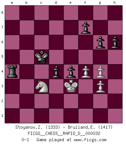Last move : 0-1 2010 January 18 20:15:36 [Event "FICGS__CHESS__RAPID_D__000032"] [Site "FICGS"] [Date "2010.01.01"] [Round "1"] [White "Stoyanov,Zdravko"] [Black "Brulland,Emmanuel"] [Result "0-1"] [WhiteElo "1333"] [BlackElo "1417"] 1.e4 c6 2.Nf3 d5 3.e5 Bf5 4.d4 e6 5.Bd3 Bxd3 6.Qxd3 a6 7.a3 c5 8.b3 Nc6 9.c3 cxd4 10.cxd4 g6 11.Bg5 Nge7 12.O-O Bg7 13.Nc3 h6 14.Bh4 Qd7 15.Na4 Qc7 16.Nc5 O-O 17.b4 Nf5 18.Rae1 Nxh4 19.Nxh4 Qc8 20.Na4 Qc7 21.Nc5 Qc8 22.Re3 b6 23.Na4 Qb7 24.Rg3 Rac8 25.b5 axb5 26.Qxb5 Nxd4 27.Qxb6 Qxb6 28.Nxb6 Rc6 29.Nd7 Rd8 30.Nf6+ Bxf6 31.exf6 Ne2+ 32.Kh1 Nxg3+ 33.hxg3 Ra8 34.Ra1 Rca6 35.Nf3 Rxa3 36.Rb1 Ra1 37.Rxa1 Rxa1+ 38.Kh2 Ra2 39.Kg1 Kf8 40.Ne5 Re2 41.Nd3 Ke8 42.Kf1 Rd2 43.Ne5 Ra2 44.Nf3 Ra7 45.Nd4 Kd7 46.f4 Ra4 47.Nc2 Kd6 48.Ke2 e5 49.Kf3 e4+ 50.Ke3 Ke6 51.g4 Kxf6 52.g3 Ke6 53.Nd4+ Kd6 54.Nb5+ Kc5 55.Nc3 d4+ 0-1 Caro-Kann defense Kingside Castling by player White (move 12) Kingside Castling by player Black (move 16) Player Black won this chess game. Follow this game move after move (download)As one by one I mowed them down, my superiority soon became apparent. (Jose Capablanca) Frage des Reporters: -Welche besonderen Umstände rechtfertigen das Anhalten der Uhren während einer Turnierpartie? Antwort: -Einen Fotographen zu strangulieren. (Siegbert Tarrasch) Un Peón pasado aumenta su poder a medida de que el número de piezas en el tablero disminuye. (Capablanca) Comme les marins qui ont mille raisons différentes d'aller en mer, les joueurs d'échecs en ont tout autant avant de s'installer devant une table et jouer... (Vincent Bertignac, philosophe) You know what they say : You lie down with the Devil, you wake up in Hell. (Horatio Caine, C.S.I. Miami)