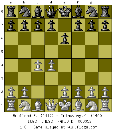Last move : 1-0 2010 February 2 8:45:52 [Event "FICGS__CHESS__RAPID_D__000032"] [Site "FICGS"] [Date "2010.01.01"] [Round "1"] [White "Brulland,Emmanuel"] [Black "Inthavong,Kiao"] [Result "1-0"] [WhiteElo "1417"] [BlackElo "1400"] 1.c4 e6 2.d4 1-0 This chess game has been lost on time (started : 2010.01.01 18:48:56) English Opening Player White won this chess game. Follow this game move after move (download)By playing at Chess then, we may learn: First: Foresight... Second: Circumspection... Third: Caution... And lastly, we learn by Chess the habit of not being discouraged by present bad appearances in the state of our affairs, the habit of hoping for a favorable chance, and that of persevering in the secrets of resources. (Benjamin Franklin) Schach ist die gewalttätigste aller Sportarten. (Garry Kasparov) Aún el Rey más flojo huye despavorido ante la amenaza de un Jaque doble. (Aaron Nimzowitsch) Fischer est le meilleur joueur du monde et Karpov n'est qu'un joueur de bistrot. (Garry Kasparov, agé de 16 ans) Real knowledge is to know the extent of one's ignorance. (Confucius)