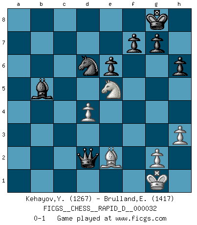 Last move : 0-1 2010 January 17 10:3:34 [Event "FICGS__CHESS__RAPID_D__000032"] [Site "FICGS"] [Date "2010.01.01"] [Round "1"] [White "Kehayov,Yulian"] [Black "Brulland,Emmanuel"] [Result "0-1"] [WhiteElo "1267"] [BlackElo "1417"] 1.e4 c6 2.d4 d5 3.exd5 cxd5 4.c3 Nf6 5.Bd3 e6 6.Nf3 Be7 7.O-O O-O 8.Bg5 Nbd7 9.Nbd2 h6 10.Bh4 a6 11.Re1 Ng4 12.h3 Bxh4 13.Nxh4 Nxf2 14.Kxf2 Qxh4+ 15.Kg1 Qe7 16.Nf3 Nf6 17.b3 b5 18.a4 Bd7 19.axb5 axb5 20.Rxa8 Rxa8 21.c4 bxc4 22.bxc4 dxc4 23.Bxc4 Qb4 24.Bf1 Ra2 25.Re2 Rxe2 26.Bxe2 Ne4 27.Qd3 Nd6 28.Ne5 Bb5 29.Qd2 Qxd2 0-1 Caro-Kann : Exchange variation Kingside Castling by player White (move 7) Kingside Castling by player Black (move 7) Player Black won this chess game. Follow this game move after move (download)The game of chess is the touchstone of the intellect. (Goethe) Das Schach ist nichts für kleine Geister, es beansprucht einen vollen Mann, der sich nicht sklavisch an das Überlieferte hält, sondern selbständig die Tiefen des Spiels zu ergründen sucht. (Wilhelm Steinitz) La batalla por la última verdad nunca sera ganada. Y es por eso que el Ajedrez es tan fascinante. (Hans Kmoch) Avec des compensations pour le matériel en plus... (Anonyme) He who is a good ruler must first have been ruled. (Aristotle)
