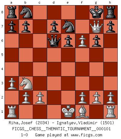 Last move : 1-0 2010 January 5 11:38:15 [Event "FICGS__CHESS__THEMATIC_TOURNAMENT__000101"] [Site "FICGS"] [Date "2010.01.01"] [Round "1"] [White "Riha,Josef"] [Black "Ignatyev,Vladimir"] [Result "1-0"] [WhiteElo "2034"] [BlackElo "1501"] 1.e4 c5 2.Nf3 e6 3.d4 cxd4 4.Nxd4 Bc5 5.Nb3 Bb4+ 6.Bd2 Qe7 7.Bxb4 Qxb4+ 8.Nc3 Nf6 9.a3 Qb6 10.e5 Ng8 11.Ne4 f6 12.Nd6+ Kf8 13.Nxc8 Qc7 14.Nd6 Ne7 15.Qh5 g6 16.Qh6+ Kg8 17.exf6 Qxd6 18.Qg7+ 1-0 Sicilian defense Player White won this chess game. Follow this game move after move (download)I thought the most common mistake [in chess] was the first one: Learning the game :P (Garvin Gray, FICGS forum) Das Zentrum ist der Balkan des Schachbretts - Kriegshandlungen können in jedem Moment ausbrechen. (Aaron Nimzowitsch) Debes de llevar a tu oponente hacia un profundo y obscuro bosque donde 2+2=5, y el camino que conduce a la salida es suficientemente ancho para solamente uno. (Mikhail Tal) On entre au jeu d'Echecs comme on entre en Religion. Pour le joueur d'Echecs, la partie d'Echecs c'est l'office, la messe, le défilé du 1er Mai, le dépôt de gerbe au Monument aux Morts. C'est un drame sacré. (Michel Roos) Political correctness is subjecting us to gross incompetence. (Johann Piek)