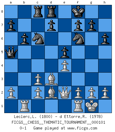 Last move : 0-1 2010 April 17 21:14:9 [Event "FICGS__CHESS__THEMATIC_TOURNAMENT__000101"] [Site "FICGS"] [Date "2010.01.01"] [Round "1"] [White "Leclerc,Luc-Olivier"] [Black "d Ettorre,Rodolfo"] [Result "0-1"] [WhiteElo "1800"] [BlackElo "1978"] 1.e4 c5 2.Nf3 e6 3.d4 cxd4 4.Nxd4 Bc5 5.Nc3 Nc6 6.Ndb5 Nf6 7.Nd6+ Ke7 8.Bf4 e5 9.Nf5+ Kf8 10.Be3 Bb4 11.Nd6 Ke7 12.Nxc8+ Rxc8 13.Bd3 Bxc3+ 14.bxc3 Qa5 15.Bd2 Rhd8 16.O-O Kf8 17.Qe2 h6 18.Rab1 b6 0-1 This chess game has been lost on time (started : 2010.01.01 20:10:51) Sicilian defense Kingside Castling by player White (move 16) Player Black won this chess game. Follow this game move after move (download)The only thing Chess players have in common is Chess. (Lodewijk Prins) Frage: Wie viele Autos haben Sie schon zerstört? - Antwort: Nur zwei. (Loek van Wely) Repentinamente, me resultaba obvio en mi analisis que yo había pasado por alto lo que Fischer había visto en el tablero con la mas grande facilidad. (Mikhail Botvinnik) Je ne suis pas le dernier à jouer lâchement des coups douteux pendant le zeïtnot de l'adversaire pour l'achever: en effet les coups qui font le plus peur sont ceux que l'on ne comprend pas. Je me fais souvent peur quand je joue. (Un professeur anonyme) I don't believe in psychology. I believe in good moves. (Bobby Fischer)
