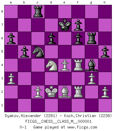Last move : 0-1 2006 August 30 13:7:11 [Event "FICGS__CHESS__CLASS_M__000001"] [Site "FICGS"] [Date "2006.04.08"] [Round "1"] [White "Dyakov,Alexander"] [Black "Koch,Christian"] [Result "0-1"] [WhiteElo "2281"] [BlackElo "2238"] 1.e4 c5 2.Nf3 d6 3.d4 cxd4 4.Nxd4 Nf6 5.Nc3 a6 6.Bg5 e6 7.f4 Qb6 8.Qd2 Qxb2 9.Rb1 Qa3 10.f5 b5 11.fxe6 Bxe6 12.Bxf6 gxf6 13.Bd3 Bh6 14.Qxh6 Qxc3+ 15.Qd2 Qxd2+ 16.Kxd2 Nd7 17.Rhf1 Rg8 18.g3 Rg6 19.Rf2 Nc5 20.a3 Kd7 21.Re1 Rag8 22.Re3 Rc8 23.Ref3 Ke7 24.Rf4 Bg4 25.Be2 h5 0-1 Sicilian : Najdorf, 7...Qb6 Player Black won this chess game. Follow this game move after move (download)It is peculiar but a fact nevertheless, that gamblers in chess always have enthusiastic followers. (Botvinnik) Offensichtlich kennt Kasparow nichts anderes als Schach, und ich könnte 500 weitere Spieler dieser Sorte benennen. (Judith Polgar) Con o sin el título, Bobby Fischer fue sin lugar a dudas el mas grande jugador de su época. (Burt Hochberg) Si je n'étais pas joueur d'échecs, je serais le meilleur dans quelque chose d'autre. (Anatoli Karpov) You can think I'm wrong, but that's no reason to quit thinking. (Gregory House, House M.D.)