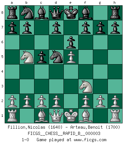 Last move : 1-0 2006 June 25 23:50:25 [Event "FICGS__CHESS__RAPID_B__000003"] [Site "FICGS"] [Date "2006.04.23"] [Round "1"] [White "Fillion,Nicolas"] [Black "Arteau,Benoit"] [Result "1-0"] [WhiteElo "1640"] [BlackElo "1700"] 1.e4 c5 2.Na3 Nf6 3.e5 Nd5 4.Nf3 e6 5.Nb5 1-0 This chess game has been lost on time (started : 2006.04.23 16:33:7) Sicilian defense Player White won this chess game. Follow this game move after move (download)He who fears an isolated Queen's Pawn should give up Chess. (Siegbert Tarrasch) Wie, soll nun auch die Opposition abgeschafft werden? Ja, es tut mir leid, Ihnen diesen Schmerz nicht ersparen zu können. (Aaron Nimzowitsch) El Ajedrez es un cuento de Hadas de las 1001 metidas de pata. (Savielly Tartakower) La solitude du joueur d'Echecs à l'approche du mat est semblable à celle du condamné. (Francis Szpiner) In fact if nothing is done against this teddy bear, hereby I announce that I would quit chess, rapid chess, blitz chess, postal chess, email chess, server chess and correspondence chess I will then switch to a table game where teddy bears aren't going to be seen for a while, like Poker, or Roulette, all 18+ games. (Elmer Valderrama)