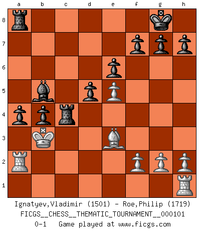 Last move : 0-1 2010 January 9 6:28:39 [Event "FICGS__CHESS__THEMATIC_TOURNAMENT__000101"] [Site "FICGS"] [Date "2010.01.01"] [Round "1"] [White "Ignatyev,Vladimir"] [Black "Roe,Philip"] [Result "0-1"] [WhiteElo "1501"] [BlackElo "1719"] 1.e4 c5 2.Nf3 e6 3.d4 cxd4 4.Nxd4 Bc5 5.c3 Qb6 6.b4 Bxd4 7.Qxd4 Qxd4 8.cxd4 Nc6 9.Be3 Nxb4 10.Na3 d5 11.e5 a6 12.O-O-O Nxa2+ 13.Kb2 Nb4 14.Nc2 Nxc2 15.Kxc2 Ne7 16.Bd3 Bd7 17.Rb1 b5 18.Ra1 O-O 19.Bd2 Rfc8+ 20.Kb3 Nc6 21.Bc3 b4 22.Bb2 a5 23.Bb5 Nxd4+ 24.Bxd4 Bxb5 25.Ra2 Rc4 26.Be3 a4+ 0-1 Sicilian defense Queenside Castling by player White (move 12) Kingside Castling by player Black (move 18) Player Black won this chess game. Follow this game move after move (download)Let the perfectionist play postal. (Yasser Seirawan) Capablanka war das größte Genie der Schachgeschichte! Aber denken sie nicht er habe nichts vom Schach verstanden. Er wusste nur soviel wie er wissen musste um seine Ziele zu erreichen. (Mikhail Moiseyevich Botvinik) No puedes jugar al Ajedrez si eres de corazón noble. (Proverbio Francés) Aidez vos pièces, elles vous aideront. (Paul Morphy) Have no fear of perfection - you'll never reach it. (Salvador Dali)