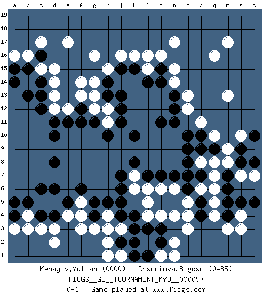 Last move : 0-1 2010 March 4 19:28:37 [Event "FICGS__GO__TOURNAMENT_KYU__000097"] [Site "FICGS"] [Date "2010.01.02"] [Round "1"] [Black "Kehayov,Yulian"] [White "Cranciova,Bogdan"] [Result "0-1"] [Rating 1 "0000"] [Rating 2 "0485"] 1.c16 q4 2.d4 q16 3.d10 q10 4.k4 k16 5.k10 e17 6.h14 d15 7.c14 g16 8.m11 f14 9.f12 g13 10.h13 g12 11.g11 h12 12.j12 h11 13.h10 f3 14.r6 q7 15.r7 q6 16.r4 r3 17.r5 q5 18.f11 j3 19.j4 h4 20.k3 h3 21.j5 d2 22.d6 c3 23.c4 o3 24.h5 r8 25.s8 r9 26.s9 s10 27.j13 s4 28.s5 s3 29.t5 t7 30.t10 t9 31.t8 s7 32.j11 g14 33.o9 r13 34.j2 h2 35.k2 f5 36.f6 d3 37.e5 n6 38.n7 l6 39.g5 f4 40.g4 g3 41.l7 m6 42.m7 n17 43.m14 o13 44.n13 o12 45.n11 n15 46.o6 o5 47.o7 k6 48.n5 n4 49.m5 l4 50.j7 d13 51.c12 k7 52.k8 b4 53.b5 b3 54.p5 o4 55.p4 p6 56.p7 h15 57.j15 j16 58.k15 m16 59.j6 l5 60.o10 r17 61.m3 m4 62.l3 c15 63.b15 b14 64.b13 b16 65.a14 c17 66.c13 d14 67.d8 e12 68.e11 d12 69.d11 f13 70.m15 n14 71.n12 p11 72.p10 a16 73.a15 p8 74.o8 n2 75.m2 e4 76.c6 l15 77.l14 l16 78.a4 a3 79.a5 j1 80.k1 h1 81.p9 q8 82.q9 m1 83.l1 n1 0-1 Here are the names of the openings (joseki) played in the four corners : Corner d16 : c16 e17 Komoku (Somok, Xiao~mu`) 3-4 Point. The komoku (3-4) point is the traditional corner enclosure move.. Ikken Kakari (Hankan Keolch'im, Yi Gua`jiao~, 1-Space Low Pincer). The small knight move is the basic approach move to the 3-4 point stone. It has been continually used for over four centuries. There are limitless variations, with new moves constantly being discovered. White 2 opens the door to a treaure store of joseki. Corner q16 : q16 m11 Hoshi (Hwajeom, Seongjeom, Xingwei`) 4-4 Point. The star or hoshi (4-4) point, emphasizing influence at the potential expense of territory. Corner d4 : d4 f3 Hoshi (Hwajeom, Seongjeom, Xingwei`) 4-4 Point. The star or hoshi (4-4) point, emphasizing influence at the potential expense of territory. Ikken Kakari (Hankan Keolch'im, Yi Gua`jiao~, 1-Space Low Approach). White 2 is the standard approach move to the 4-4. Corner q4 : q4 r6 Hoshi (Hwajeom, Seongjeom, Xingwei`) 4-4 Point. The star or hoshi (4-4) point, emphasizing influence at the potential expense of territory. Ikken Kakari (Hankan Keolch'im, Yi Gua`jiao~, 1-Space Low Approach). Black 2 is the standard approach move to the 4-4. Player White won this Go (weiqi, baduk) game. Follow this game move after move (download)Learn to play under the stones. (Anonymous) The good fighters of old first put themselves beyond the possibility of defeat, and then waited for an opportunity of defeating the enemy. (Sun Tzu)