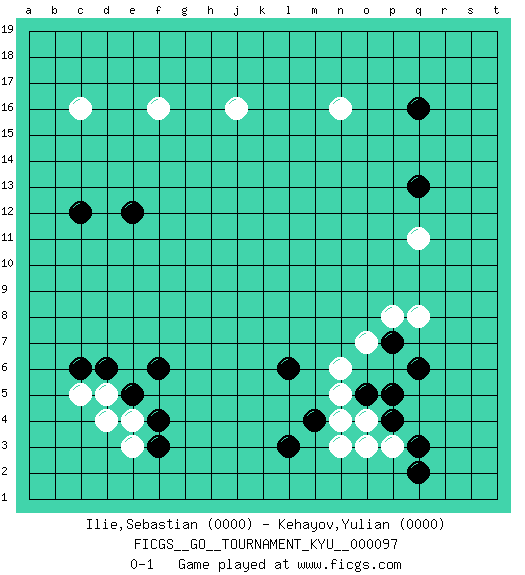 Last move : 0-1 2010 February 27 21:30:4 [Event "FICGS__GO__TOURNAMENT_KYU__000097 "] [Site "FICGS"] [Date "2010.01.02"] [Round "1"] [Black "Ilie,Sebastian "] [White "Kehayov,Yulian "] [Result "0-1"] [Rating 1 "0000"] [Rating 2 "0000"] 1.q16 d4 2.q3 c16 3.f3 j16 4.c6 c5 5.d6 e3 6.f4 e4 7.e5 d5 8.f6 f16 9.c12 n16 10.q13 q8 11.q6 q11 12.e12 n3 13.l3 p3 14.p4 o3 15.q2 o4 16.p5 n6 17.o5 n5 18.m4 n4 19.l6 o7 20.p7 p8 0-1 This go game has been lost on time (started : 2010.01.02 10:15:42) Here are the names of the openings (joseki) played in the four corners : Corner d4 : d4 f3Hoshi (Hwajeom, Seongjeom, Xingwei`) 4-4 Point. The star or hoshi (4-4) point, emphasizing influence at the potential expense of territory.Ikken Kakari (Hankan Keolch'im, Yi Gua`jiao~, 1-Space Low Approach). Black 2 is the standard approach move to the 4-4. Corner q16 : q16 n16Hoshi (Hwajeom, Seongjeom, Xingwei`) 4-4 Point. The star or hoshi (4-4) point, emphasizing influence at the potential expense of territory.Nikken Takagakari (Dukan Nop'dakeolch'im, E`r Gaojia, 2-Space High Approach). White 2 is a light approach move. Rarely played in even games, White 2 is typically employed in handicap games. Black continues with 6-4 or 3-10. In Korean Sunjang Baduk Black has a stone on 8-4. Corner q4 : q3 q8Komoku (Somok, Xiao~mu`) 3-4 Point. The komoku (3-4) point is the traditional corner enclosure move.. Player White won this Go (weiqi, baduk) game.Follow this game move after move (download ) In the corner, five stones in a row on the third line are alive. (Anonymous) All politicians must be presumed guilty until they are proven innocent. (Dinesh De Silva)