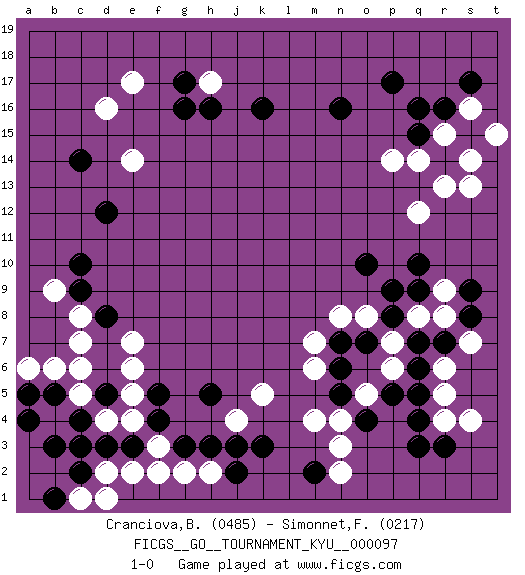 Last move : 1-0 2010 February 3 20:53:35 [Event "FICGS__GO__TOURNAMENT_KYU__000097"] [Site "FICGS"] [Date "2010.01.02"] [Round "1"] [Black "Cranciova,Bogdan"] [White "Simonnet,Franck"] [Result "1-0"] [Rating 1 "0485"] [Rating 2 "0217"] 1.q16 d4 2.q4 d16 3.q10 f3 4.c10 c7 5.c14 e17 6.k16 r6 7.o4 s4 8.r3 r4 9.q3 q8 10.k3 k5 11.d12 e14 12.g16 q12 13.r14 p14 14.p17 m4 15.m2 s13 16.o10 r15 17.q15 q14 18.s15 s14 19.r16 r13 20.n16 h17 21.h16 r15 22.d8 e7 23.g17 s16 24.s17 t15 25.p8 p6 26.q9 b9 27.c9 c8 28.c3 d2 29.c2 b4 30.d3 e2 31.c4 c5 32.d5 e4 33.b5 c6 34.b3 c1 35.b1 d1 36.q7 r8 37.q6 a6 38.a5 b6 39.a4 p7 40.q5 r5 41.r7 s7 42.n6 m6 43.e3 g2 44.f4 e5 45.f5 e6 46.g3 f2 47.h3 h2 48.j2 n3 49.h5 j4 50.j3 n2 51.n7 o8 52.p9 o5 53.n5 n4 54.p5 n8 55.o7 m7 56.s8 r9 57.s9 1-0 Here are the names of the openings (joseki) played in the four corners : Corner d16 : d16 c14 Hoshi (Hwajeom, Seongjeom, Xingwei`) 4-4 Point. The star or hoshi (4-4) point, emphasizing influence at the potential expense of territory. Ikken Kakari (Hankan Keolch'im, Yi Gua`jiao~, 1-Space Low Approach). Black 2 is the standard approach move to the 4-4. Corner q4 : q4 r6 Hoshi (Hwajeom, Seongjeom, Xingwei`) 4-4 Point. The star or hoshi (4-4) point, emphasizing influence at the potential expense of territory. Ikken Kakari (Hankan Keolch'im, Yi Gua`jiao~, 1-Space Low Approach). White 2 is the standard approach move to the 4-4. Corner q16 : q16 q12 Hoshi (Hwajeom, Seongjeom, Xingwei`) 4-4 Point. The star or hoshi (4-4) point, emphasizing influence at the potential expense of territory. Player Black won this Go (weiqi, baduk) game. Follow this game move after move (download)Learn the eye-stealing tesuji. (Anonymous) Everybody lies. (Gregory House, House M.D.)