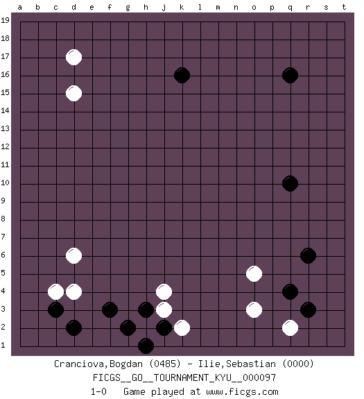 Last move : 1-0 2010 February 18 8:57:25 [Event "FICGS__GO__TOURNAMENT_KYU__000097"] [Site "FICGS"] [Date "2010.01.02"] [Round "1"] [Black "Cranciova,Bogdan"] [White "Ilie,Sebastian"] [Result "1-0"] [Rating 1 "0485"] [Rating 2 "0000"] 1.q16 d17 2.q4 d4 3.k16 d15 4.f3 j4 5.q10 o3 6.r6 q2 7.r3 o5 8.d2 d6 9.j2 h2 10.h3 j3 11.g2 k2 12.c3 c4 13.h1 1-0 This go game has been lost on time (started : 2010.01.02 10:15:42) Here are the names of the openings (joseki) played in the four corners : Corner d4 : d4 f3 Hoshi (Hwajeom, Seongjeom, Xingwei`) 4-4 Point. The star or hoshi (4-4) point, emphasizing influence at the potential expense of territory. Ikken Kakari (Hankan Keolch'im, Yi Gua`jiao~, 1-Space Low Approach). Black 2 is the standard approach move to the 4-4. Corner q4 : q4 o3 Hoshi (Hwajeom, Seongjeom, Xingwei`) 4-4 Point. The star or hoshi (4-4) point, emphasizing influence at the potential expense of territory. Ikken Kakari (Hankan Keolch'im, Yi Gua`jiao~, 1-Space Low Approach). White 2 is the standard approach move to the 4-4. Player Black won this Go (weiqi, baduk) game. Follow this game move after move (download)Corner, side, centre. (Anonymous) Heh, heh, heh. Time to abandon ship. (General Grievous in Star Wars ep.3)