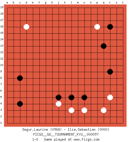 Last move : 1-0 2010 March 6 9:37:53 [Event "FICGS__GO__TOURNAMENT_KYU__000097"] [Site "FICGS"] [Date "2010.01.02"] [Round "1"] [Black "Segur,Laurine"] [White "Ilie,Sebastian"] [Result "1-0"] [Rating 1 "0968"] [Rating 2 "0000"] 1.c4 q3 2.r16 d16 3.r9 r5 4.c8 p16 5.q13 j4 6.n5 n3 7.l5 l3 8.j5 1-0 This go game has been lost on time (started : 2010.01.02 10:15:42) Here are the names of the openings (joseki) played in the four corners : Corner q4 : q3 r9 Komoku (Somok, Xiao~mu`) 3-4 Point. The komoku (3-4) point is the traditional corner enclosure move.. Corner q16 : r16 p16 Komoku (Somok, Xiao~mu`) 3-4 Point. The komoku (3-4) point is the traditional corner enclosure move.. Ikken Takagakari (Hankan Nop'dakeolch'im, Yi Gaogua`jiao~, 1-Space High Approach). The 5-4 approach move has become more popular in modern times, as modern Go emphasizes speed and influence. Player Black won this Go (weiqi, baduk) game. Follow this game move after move (download)More haste less speed. (John Fairbairn) There are two types of people in this world, good and bad. The good sleep better, but the bad seem to enjoy the waking hours much more. (Woody Allen)