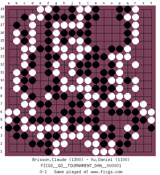 Last move : 0-1 2006 December 22 0:5:41 [Event "FICGS__GO__TOURNAMENT_DAN__000001"] [Site "FICGS"] [Date "2006.10.14"] [Round "1"] [Black "Brisson,Claude"] [White "Xu,Daniel"] [Result "0-1"] [Rating 1 "1300"] [Rating 2 "1100"] 1.q16 d4 2.r4 d16 3.f3 d6 4.l3 r3 5.q3 q4 6.q2 h3 7.f5 h5 8.f7 l4 9.m4 m3 10.n3 m2 11.l5 k4 12.k5 n4 13.m5 k3 14.o4 r9 15.r5 r12 16.f17 d17 17.l17 j17 18.f15 d14 19.l15 j15 20.f13 j13 21.d8 c7 22.j7 j11 23.d12 c12 24.m12 l12 25.m13 m11 26.l11 l10 27.k11 k10 28.k12 k13 29.l13 j12 30.l12 d11 31.f11 g12 32.f12 h9 33.m10 r17 34.q17 r16 35.q15 r15 36.m9 h7 37.d2 c8 38.c3 g2 39.b5 e3 40.d5 c5 41.e2 f4 42.c11 c13 43.d10 q14 44.p14 q13 45.h6 g6 46.j6 g7 47.q10 r10 48.f6 f8 49.g5 g4 50.e7 g11 51.e5 c4 52.b4 e4 53.f9 k18 54.l18 g16 55.f16 g14 56.f14 g15 57.g8 q18 58.p18 r18 59.p19 r7 60.h18 h17 61.g18 b11 62.c10 b10 63.q6 p8 64.n2 l2 65.o7 p7 66.p6 o8 67.n8 p13 68.o14 s6 69.s5 e18 70.h8 j9 71.k8 b6 72.j18 k17 73.f2 l19 74.m19 k19 75.m18 o10 76.o11 p11 77.o12 p12 78.o9 p9 79.n10 p10 80.g10 h10 81.q7 q8 82.c9 b9 83.j5 h4 84.g3 g1 85.f1 h2 86.g13 h13 87.r6 s7 88.k16 n1 89.j16 o2 90.h16 g17 91.h15 h14 92.f18 k9 93.o3 n7 94.o6 m8 95.n9 l9 96.n11 l8 97.m7 l7 98.m6 a5 99.b3 k15 100.l16 o13 101.n13 l14 102.m14 k14 103.p2 o1 104.p1 m1 105.c15 d15 106.c18 d18 107.b17 b16 108.j4 j3 109.q19 r19 110.a4 a6 111.c16 b15 112.d13 c14 113.k7 t5 114.t4 t6 115.e14 f19 116.g19 e19 117.g9 d7 118.j19 l6 119.pass pass 0-1 Here are the names of the openings (joseki) played in the four corners : Corner d4 : d4 f3 Hoshi (Hwajeom, Seongjeom, Xingwei`) 4-4 Point. The star or hoshi (4-4) point, emphasizing influence at the potential expense of territory. Ikken Kakari (Hankan Keolch'im, Yi Gua`jiao~, 1-Space Low Approach). Black 2 is the standard approach move to the 4-4. Corner q16 : q16 r12 Hoshi (Hwajeom, Seongjeom, Xingwei`) 4-4 Point. The star or hoshi (4-4) point, emphasizing influence at the potential expense of territory. Corner d16 : d16 f17 Hoshi (Hwajeom, Seongjeom, Xingwei`) 4-4 Point. The star or hoshi (4-4) point, emphasizing influence at the potential expense of territory. Ikken Kakari (Hankan Keolch'im, Yi Gua`jiao~, 1-Space Low Approach). Black 2 is the standard approach move to the 4-4. Player White won this Go (weiqi, baduk) game. Follow this game move after move (download)Don't make dango's. (Anonymous) Games, world of games... There's always an opponent, and there's always a victim. (Revolver, movie)