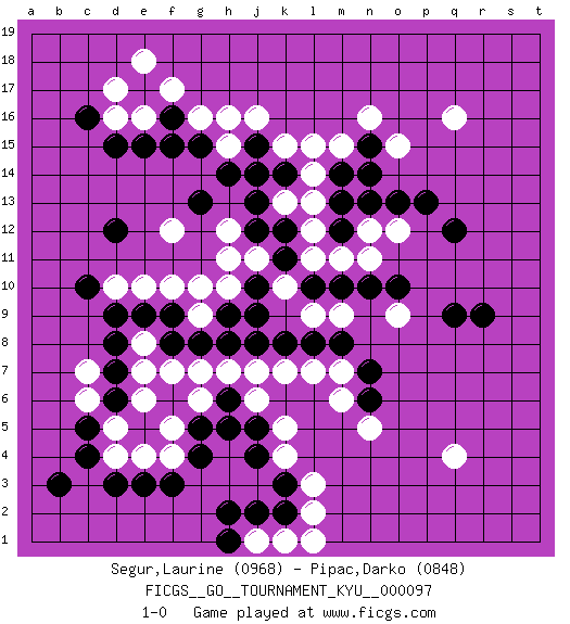 Last move : 1-0 2010 July 13 21:27:33 [Event "FICGS__GO__TOURNAMENT_KYU__000097"] [Site "FICGS"] [Date "2010.01.02"] [Round "1"] [Black "Segur,Laurine"] [White "Pipac,Darko"] [Result "1-0"] [Rating 1 "0968"] [Rating 2 "0848"] 1.c4 q16 2.c16 q4 3.r9 d10 4.d12 c7 5.q12 d5 6.d8 e7 7.d7 c6 8.e9 e8 9.d9 e10 10.f9 f10 11.d6 e6 12.g8 g7 13.f3 g9 14.f8 f7 15.h9 g10 16.h8 h10 17.h6 h7 18.j8 j7 19.k8 k7 20.m8 l7 21.l8 m7 22.n7 m6 23.n6 n5 24.c10 g16 25.j15 l15 26.n15 n16 27.m14 m15 28.k14 l14 29.n13 l13 30.g13 k13 31.f15 h15 32.h14 j16 33.g15 h16 34.j10 j11 35.j12 k10 36.j9 h12 37.k11 h11 38.j13 k15 39.j14 e4 40.e3 f12 41.f16 f17 42.e17 e18 43.l10 d17 44.d15 e16 45.e15 d16 46.g5 f5 47.g4 f4 48.c5 d4 49.d3 g6 50.j5 k5 51.j4 j6 52.h5 k4 53.k3 l3 54.k2 l2 55.b3 k1 56.j2 j1 57.h1 l1 58.h2 o15 59.n14 n12 60.o13 o12 61.p13 m11 62.m12 l12 63.m13 l11 64.k12 l9 65.m10 m9 66.n10 n11 67.o10 o9 68.q9 1-0 This go game has been lost on time (started : 2010.01.02 10:15:42) Here are the names of the openings (joseki) played in the four corners : Corner q4 : q4 r9 Hoshi (Hwajeom, Seongjeom, Xingwei`) 4-4 Point. The star or hoshi (4-4) point, emphasizing influence at the potential expense of territory. Corner d4 : c4 c7 Komoku (Somok, Xiao~mu`) 3-4 Point. The komoku (3-4) point is the traditional corner enclosure move.. Corner q16 : q16 q12 Hoshi (Hwajeom, Seongjeom, Xingwei`) 4-4 Point. The star or hoshi (4-4) point, emphasizing influence at the potential expense of territory. Player Black won this Go (weiqi, baduk) game. Follow this game move after move (download)... {it is} something unearthly... if there are sentient beings on other planets, then they play go. (Emanuel Lasker, chess world champion) The Internet is so big, so powerful and pointless that for some people it is a complete substitute for life. (Andrew Brown)